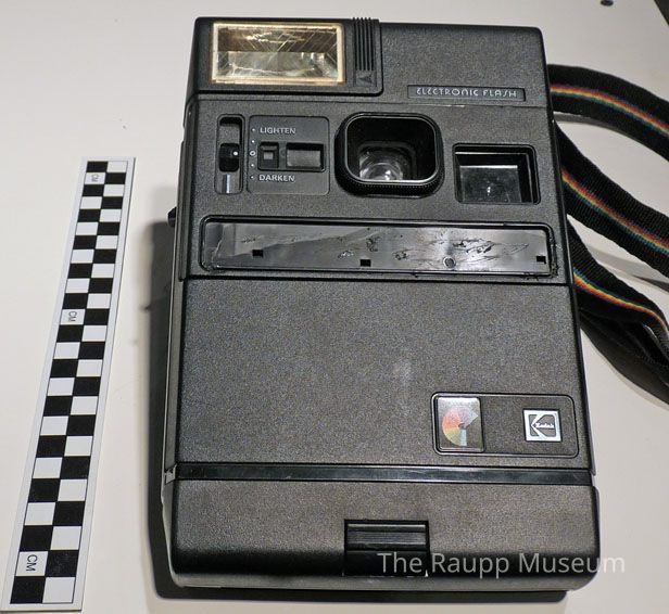 Black plastic instant camera with nylon rainbow strap. Front has discolored clear plastic flash with side pull out panel to activate; lens in center with viewfinder in the upper center. Black switch to lighten or darken the image. Film cartridge can be inserted at the base. Flat rectangular brand name panel missing below the lens. Reverse side has viewfinder and battery compartment. Blue plastic monogram initials "DVF"Dimensions