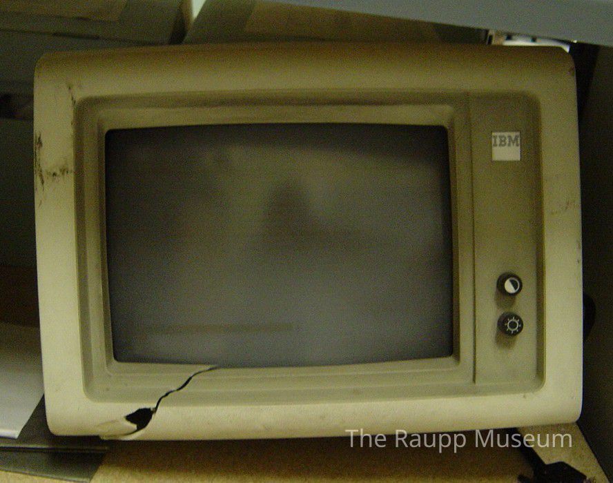 Faded white computer monitor with dark screen. IBM labeled. Attached to CPU nobes for contrast and light adjustment. One cord attached to CPU. Airvents present for cooling.Dimensions