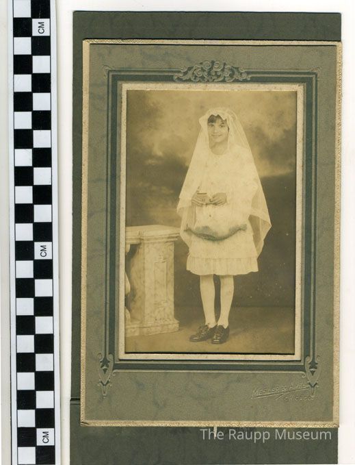 Black and white professional photo with sepia tones. Image of a girl wearing a confirmation dress and veil standing next to a marble end table. Her dress is knee-length with a three-tiered ruffle skirt and she is wearing white tights with lace-up shoes. She also has dark bangs.