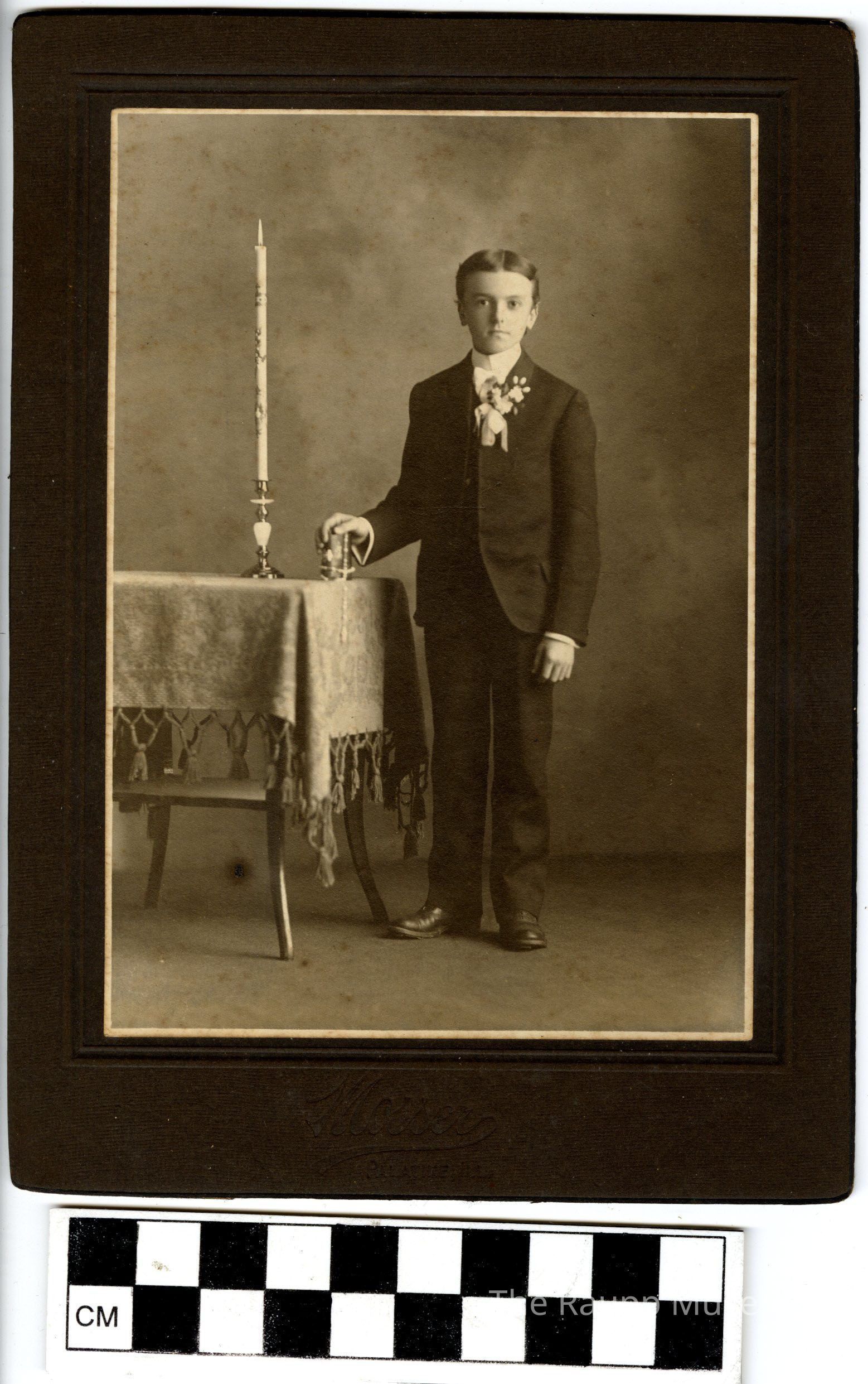 One (1) black and white sepia toned photograph of an unidentified young man. He is dressed for his Confirmation/First Communion portrait. The boy (adolescent) is wearing a three piece black suit with white undershirt and tie. He has on a white boutonniere on his left lapel. His right hand is resting on top of a small Bible on a wooden table. A rosary is wrapped around the Bible. There is a candlestick with large white candle, lit, to the right on the table as well. There is a decorative tablecloth over the table, and neutral background.