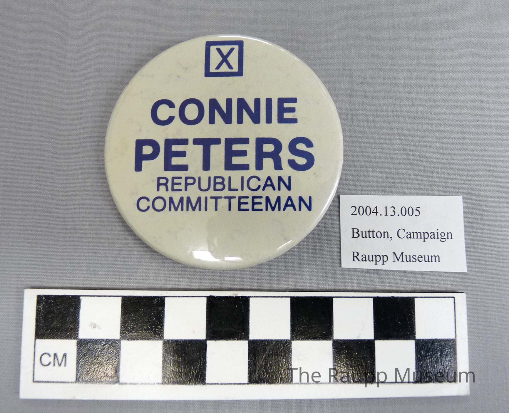 One (1) round metal campaign button with a white background and blue text: "Connie Peters Republican Committeeman". The back is silver with a safety pin attachement. On the back is etched "Badge-A-Minit, La Salle ILL, 61301".Material