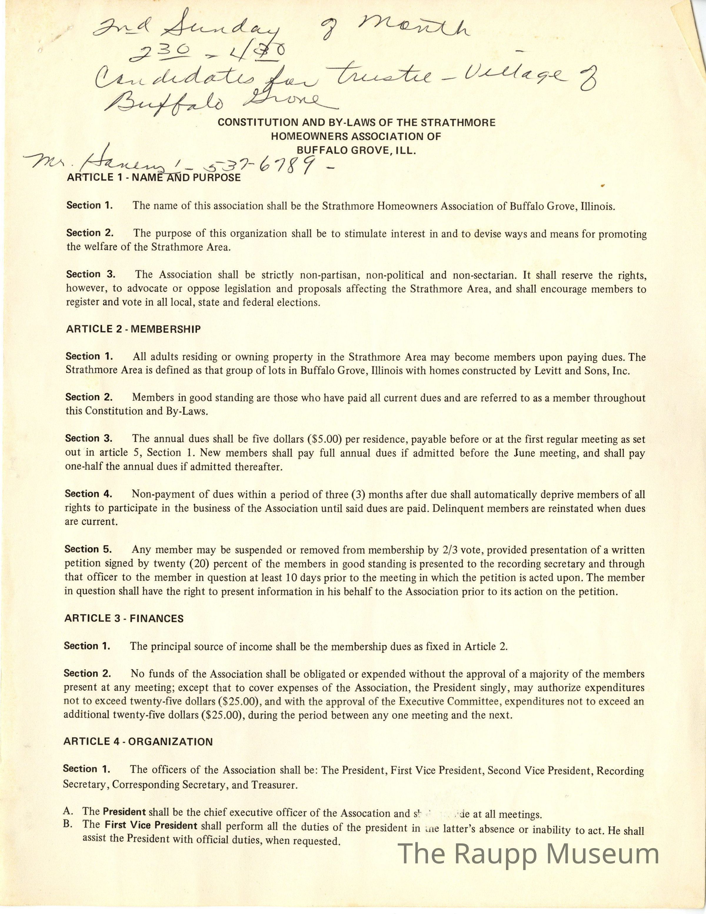 One (1) single sided four page "Constitution and By-Laws of the Strathmore Homeowners Association of Buffalo Grove, ILL". Contains nine articles with sections within each article. On the top is handwritten "2nd Sunday of Month 2:30-4:30 Candidates for trustee-village of Buffalo Grove, Mr. Hanens - 537-6789".Archive Details