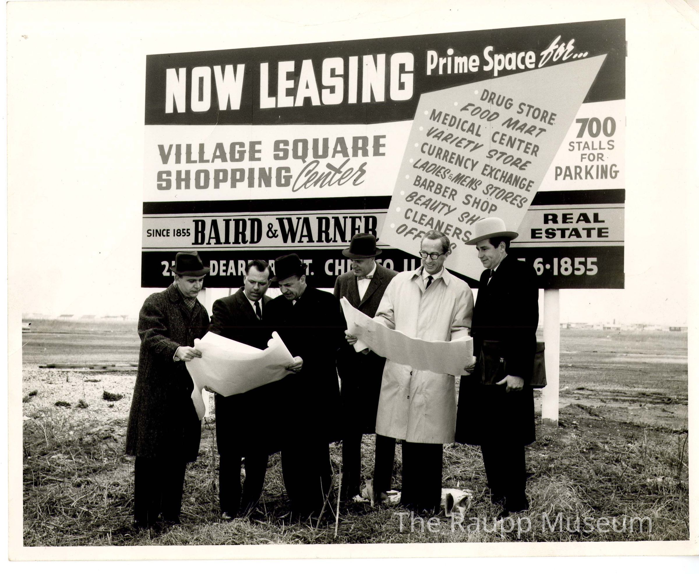 One (1) black and white photograph of 6 men standing outside in front of a billboard advertising space in the upcoming Village Square Shopping Center. The man on the right is Al Frank (black coat, light bowler hat),followed by a man in long light jacket holding a large paper and a man behind him with a long dark jacket and a bowler hat looking to his right. On his right are three other men holding some large papers and pointing at the paper. Man on the far left has checkered jacket and bowler hat, man to his left has black suit on, and on his left is a man in long black jacket and bowler hat. There are standing in an open field area.Relationships