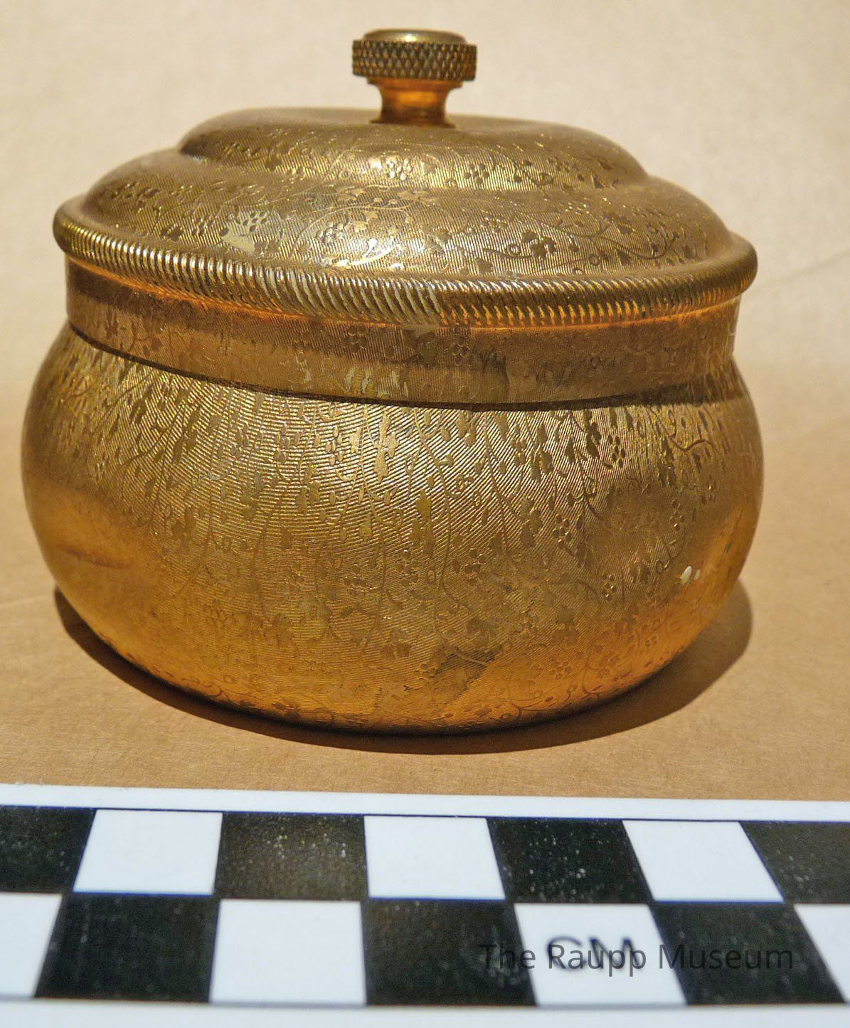 Short, round cast brass cosmetic pot with separate lid. "Pozzoni's Complexion Powder" embossed into the interior of the base. Embossed acanthus design with slight dupioni silk pattern etched into exterior of lid and base. Lid has small knob handle.