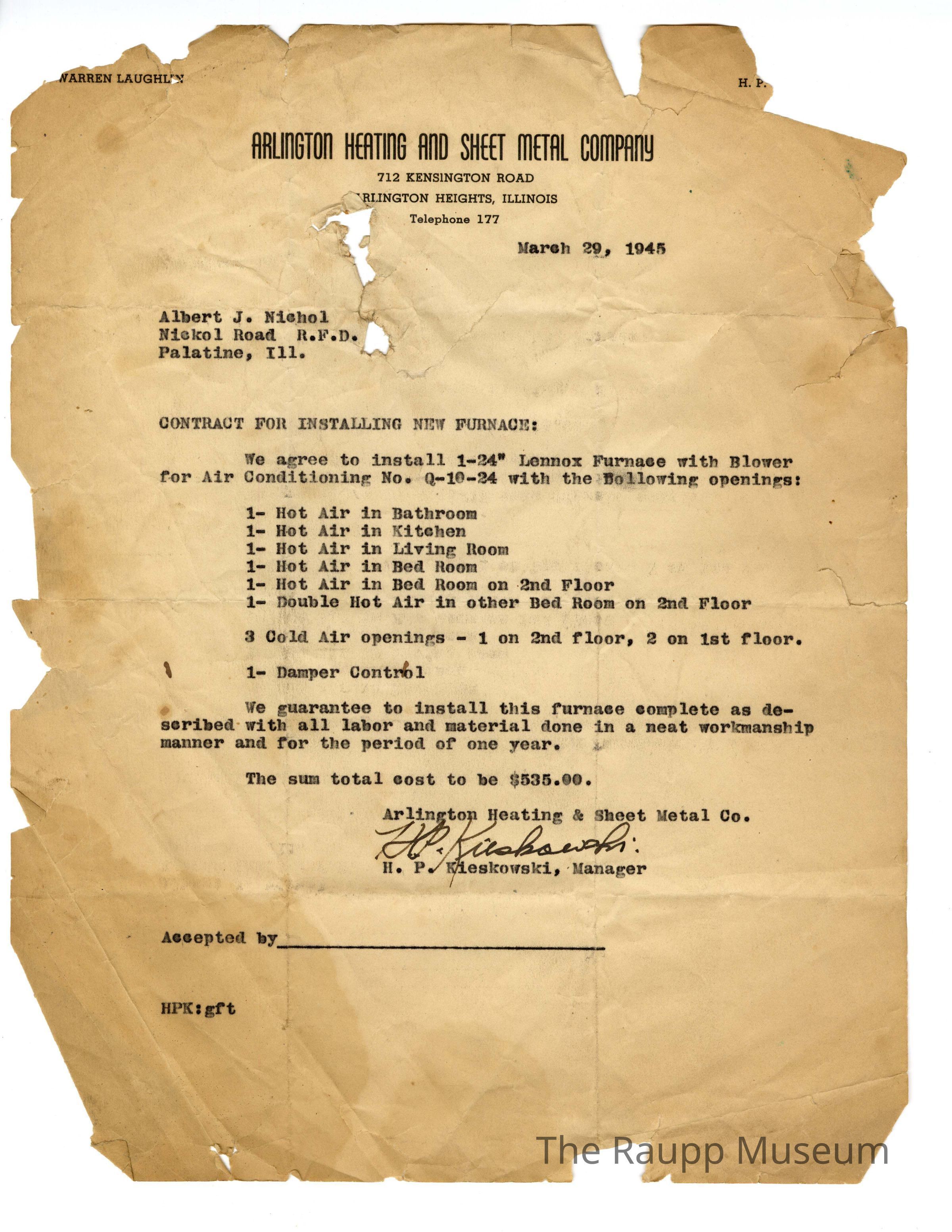 One (1) brown rectangular contract/receipt from Arlington Heating and Sheet Metal Company to Albert J. Nichol. In the form of a letter, this receipt contains an estimate for installing a Lennox furnace with blower for air conditioning throughout Albert's home. The estimate total is $535.00. Letter is dated March 29, 1945. Receipt has preprinted text at top, with typed text underneath.Archive Details