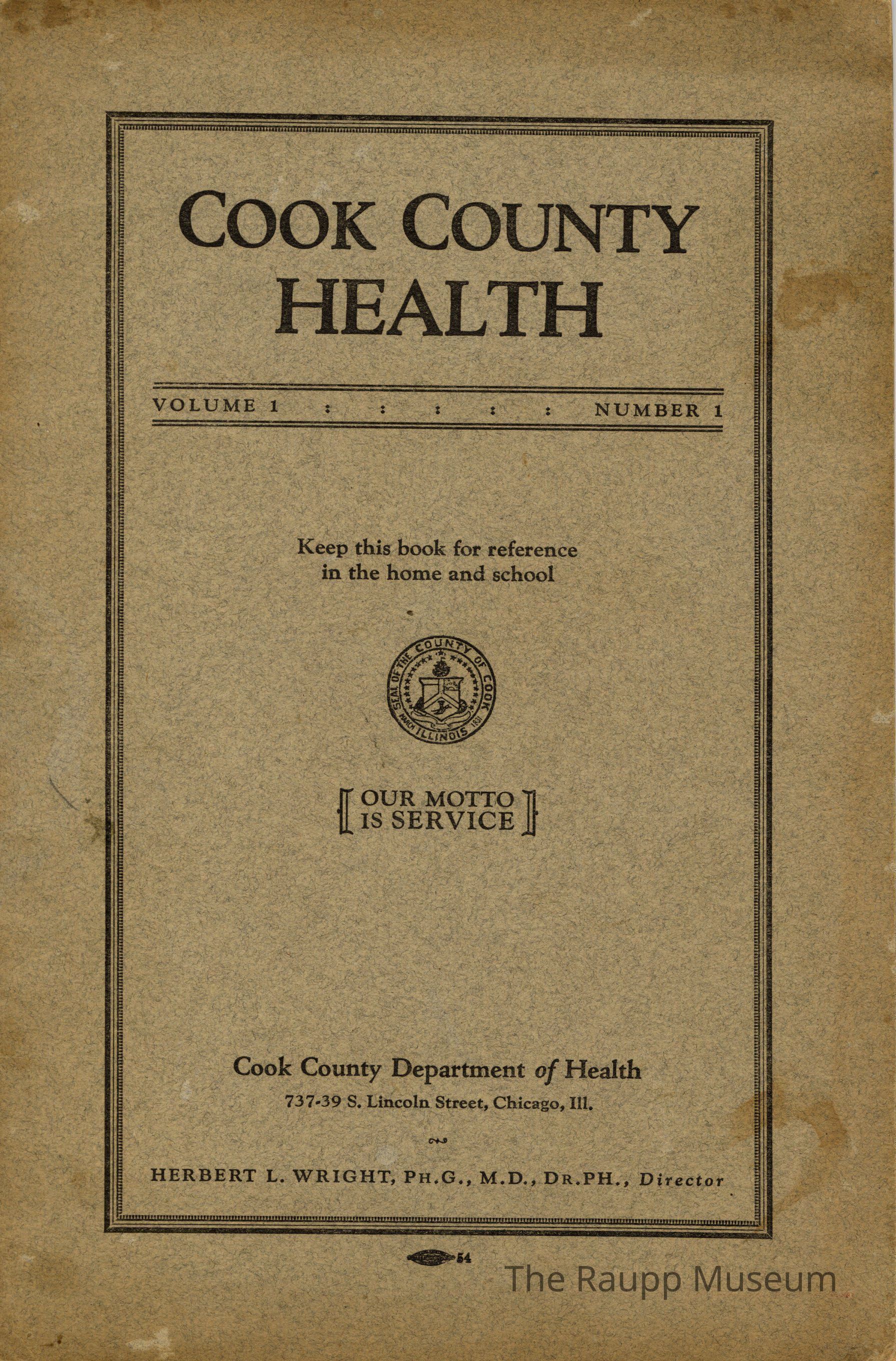 One (1) 24 page booklet, containing health information and laws for the public, published by Cook County Department of Health. Booklet has a brown cardboard cover, and 24 pages of information and black and white photos. Health topics are geared toward taking care of children. Topics include: quaratine, health rules for children, poisons and antidotes, and health and taxes.