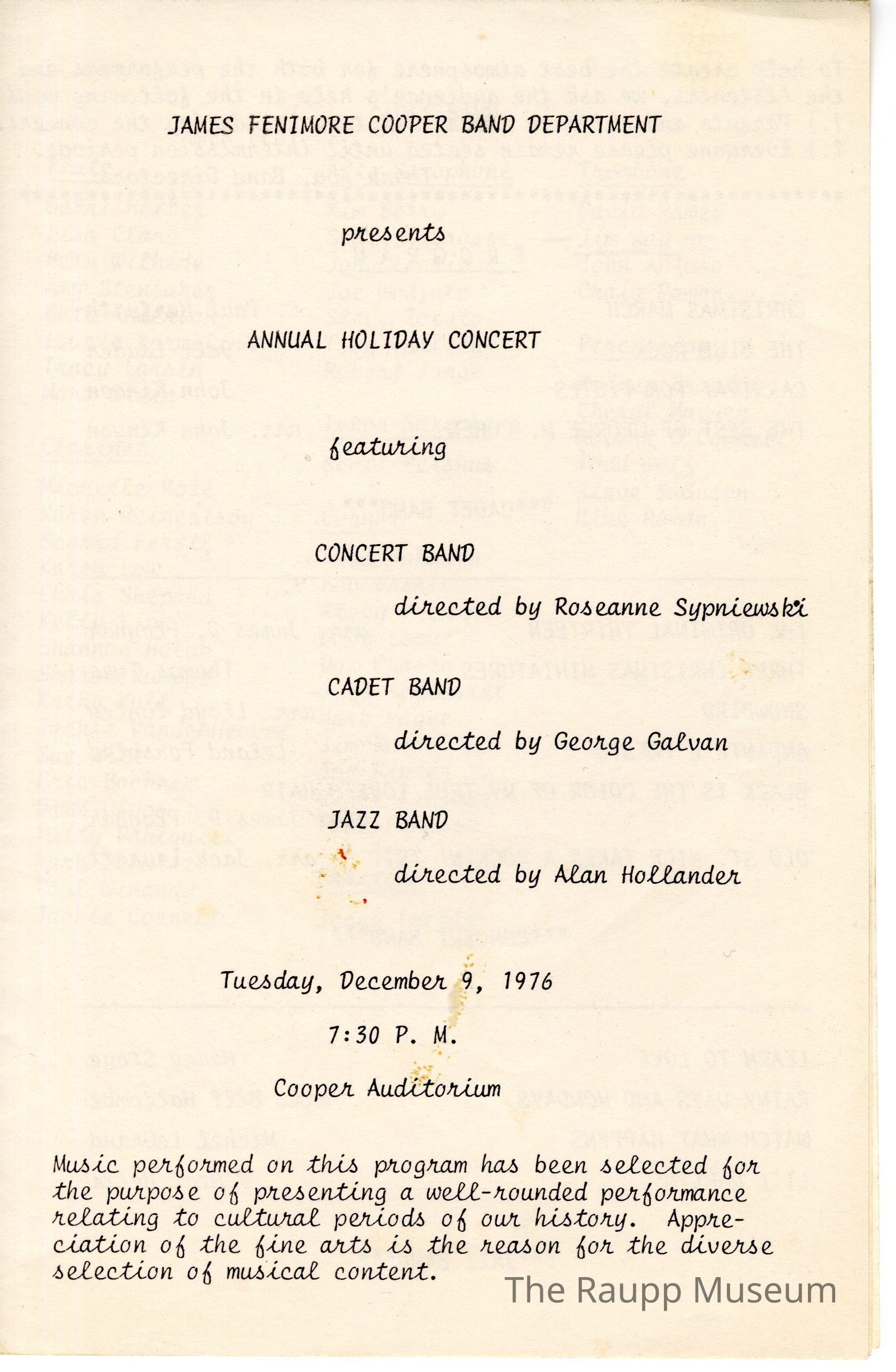 One (1) Cooper Junior High School Band Department Annual Holiday Concert 1976 program. Program is four pages, with a front and back. Program lists the songs performed, members of the bands, and acknowledgements. White paper with black printed text.Archive Items Details