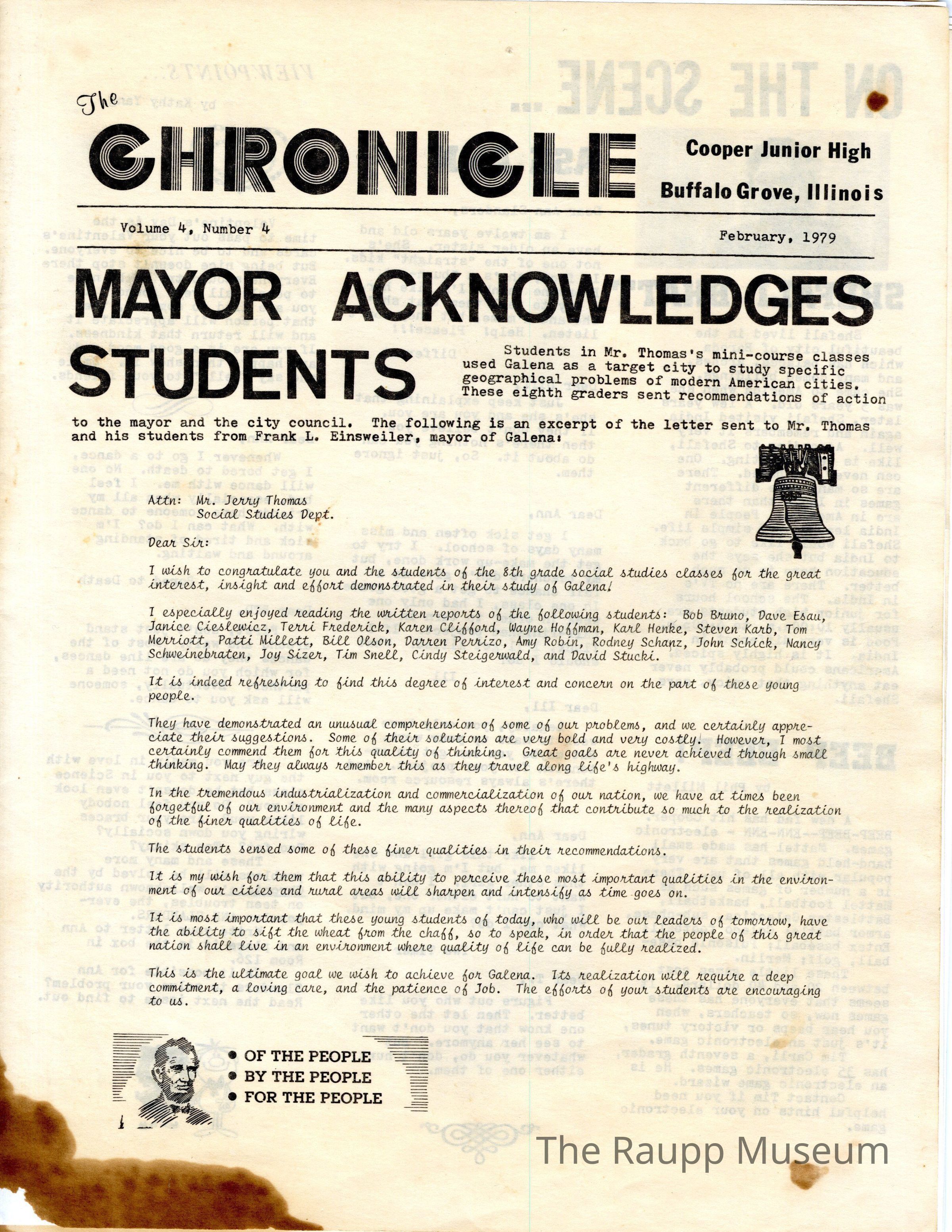 One (1) newspaper from Cooper Junior High, titled "The Chronicle" from February 1979. Paper is 7 pages, black and white with text and images. On the back is a drawing of a heart with cartoon characters, including from Snoopy, and inside the heart is "Happy Valentines Day" with "Holzapfel" underneath. Contains articles about what is happening at the school and pictures throughout. There are also cartoons and drawings throughout.Archive Items Details