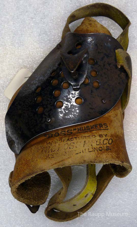 Cornhusking glove. Leather glove-shaped panel without fingers with buckle straps to keep around the wrist. Shaped, perforated metal overlay over the leather with metal husking pin attached to the center. Worn around the hand and wrist.