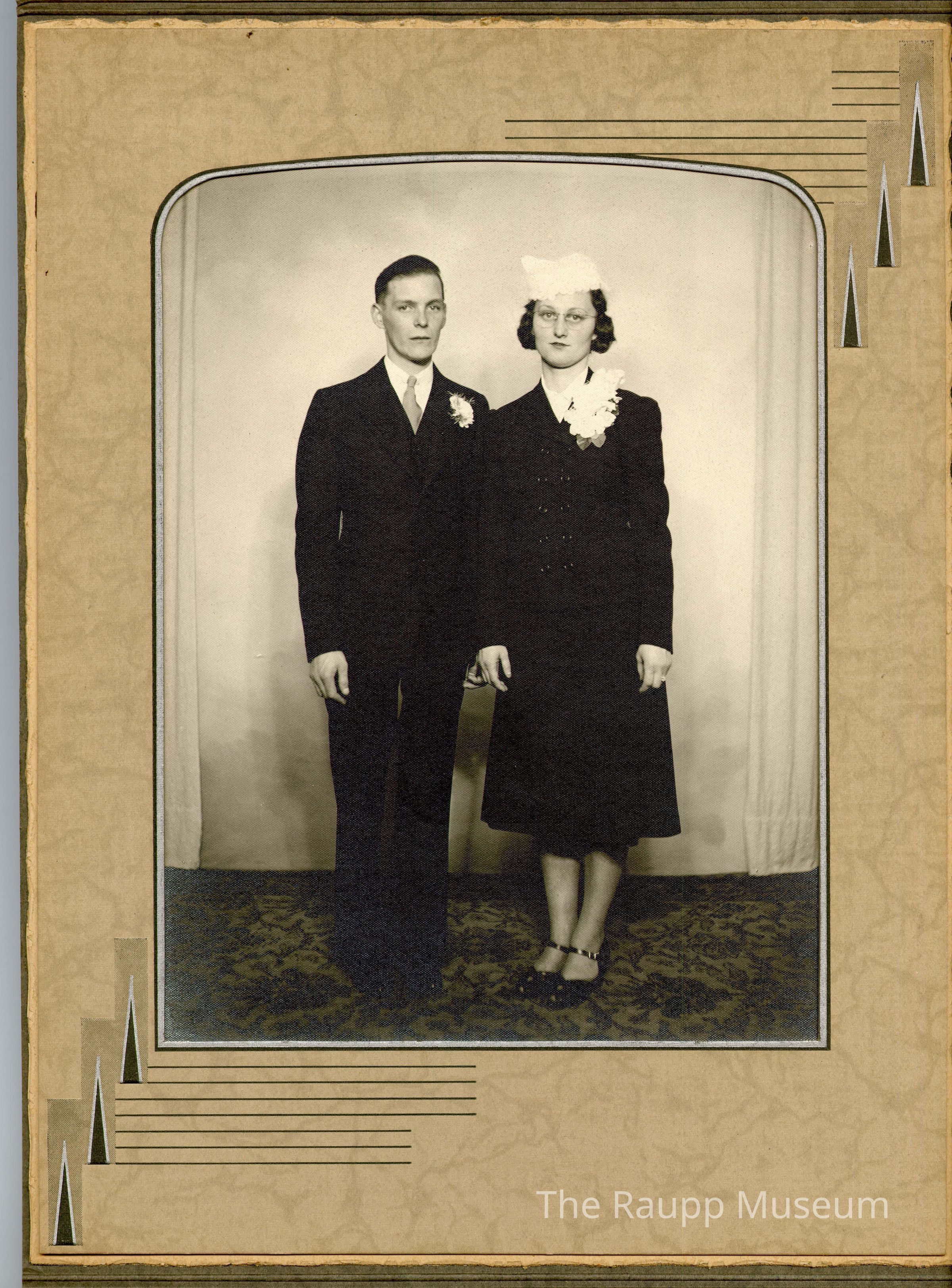 One (1) black and white photograph of a formally dressed couple standing side by side. The man is wearing a suit with a boutonniere on his left lapel. Standing on his left is a woman dressed in a tailored dark dress with a decorative corsage on her left lapel, and a white hat on her curled hair. The background features a white curtain, and they are standing on a decorative rug/carpet.