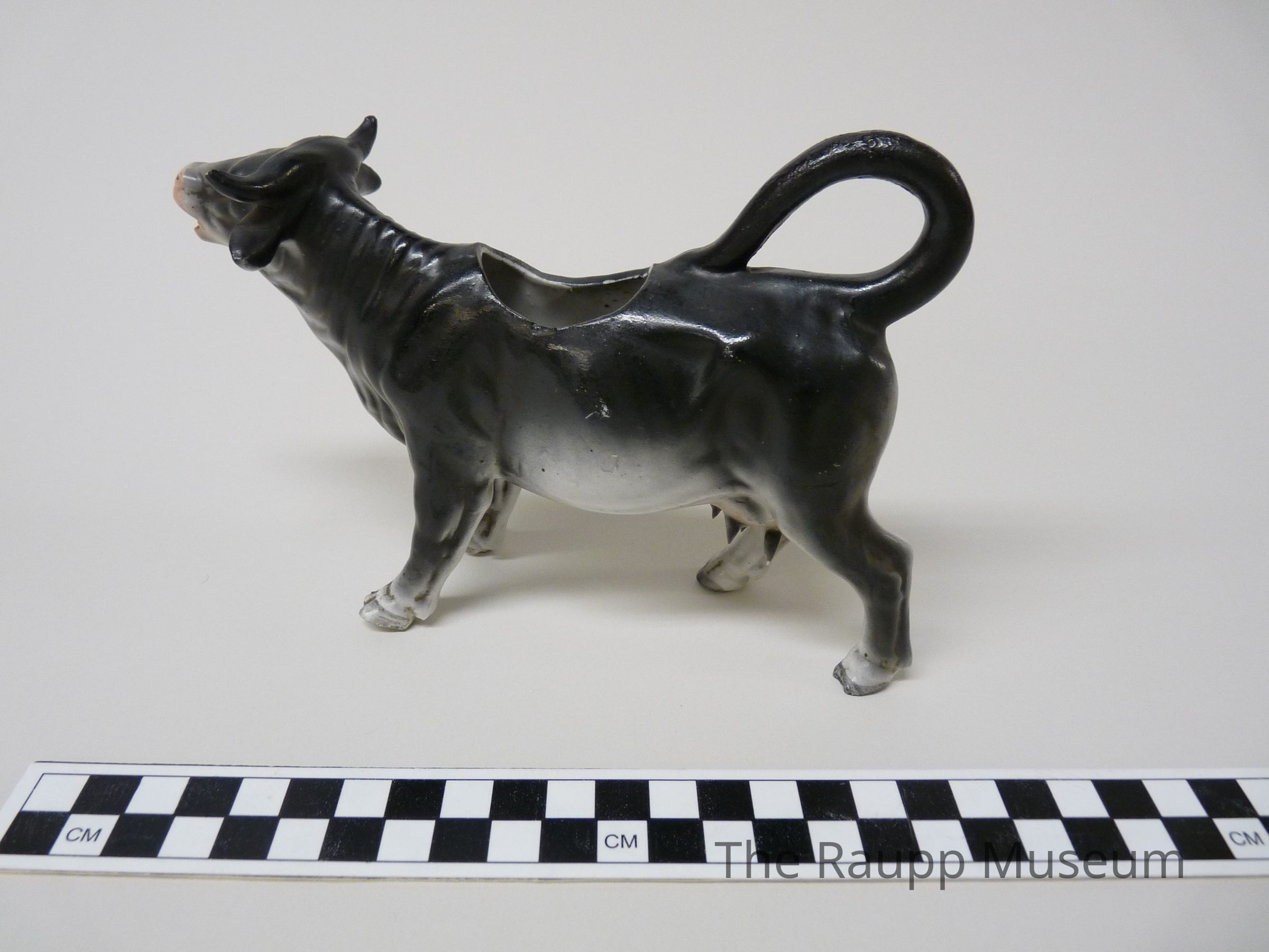 One (1) black, grey, white, and pink creamer. Creamer is shaped like a cow with white and pink accents. The cream is put into cows stomach and comes out of the mouth. Tail makes the handle. On the stomach "Germany" is imprinted as well as part of a finger print.Dimensions