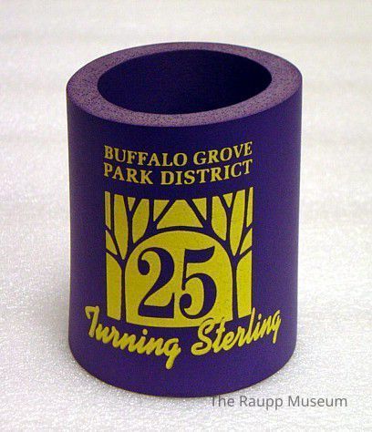 One (1) purple with yellow print, foam and vinyl can cozy. Purple foam cup with white foam bottom with hole for drainage. Yellow vinyl print ("Buffalo Grove Park District 25 Turning Sterling", "Take Time for Fun Buffalo Grove Park District"). Advertising logo displays a watch with its hands on the state of Illinois, and a tree design with "25" in the center.Dimensions