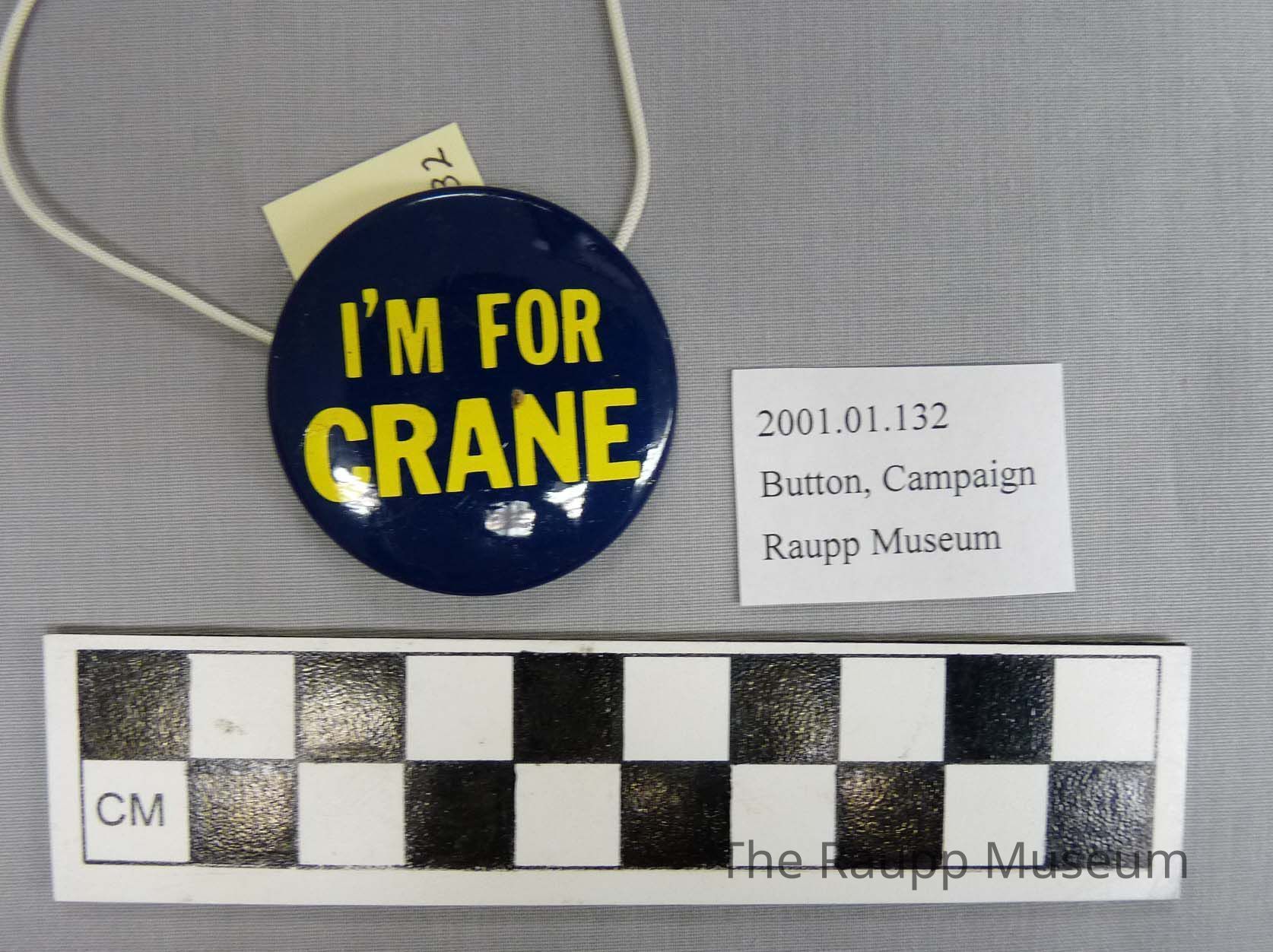 One (1) campaign button, with text "I'm for Crane" in yellow text on a blue background. On the back it is silver metal with a metal pin.