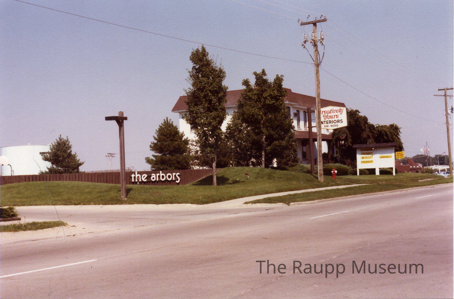 Color photographic print. Image of the exterior of a white two-story commercial building with a sign in front mounted to a brown pole: "Creatively Yours Interiors" and located on Dundee Road. Building was the former location of the J.B. Weidner cheese factory. Low brown fence on the left side of the image with white text: "the arbors." Image shot from across the street. reverse side stamp: "Print made by Kodak Aug 81." Image printed on Kodak paper.Made/Created