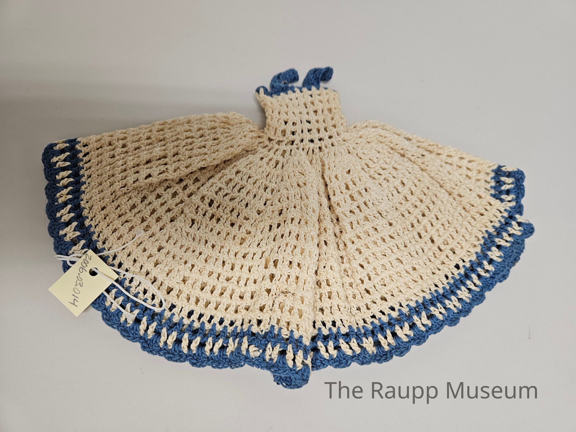 One (1) crocheted doll dress with full circular skirt and top with straps. Skirt and bodice are blue. Straps, border of skirt and bodice, and back laces are blue.Dimensions