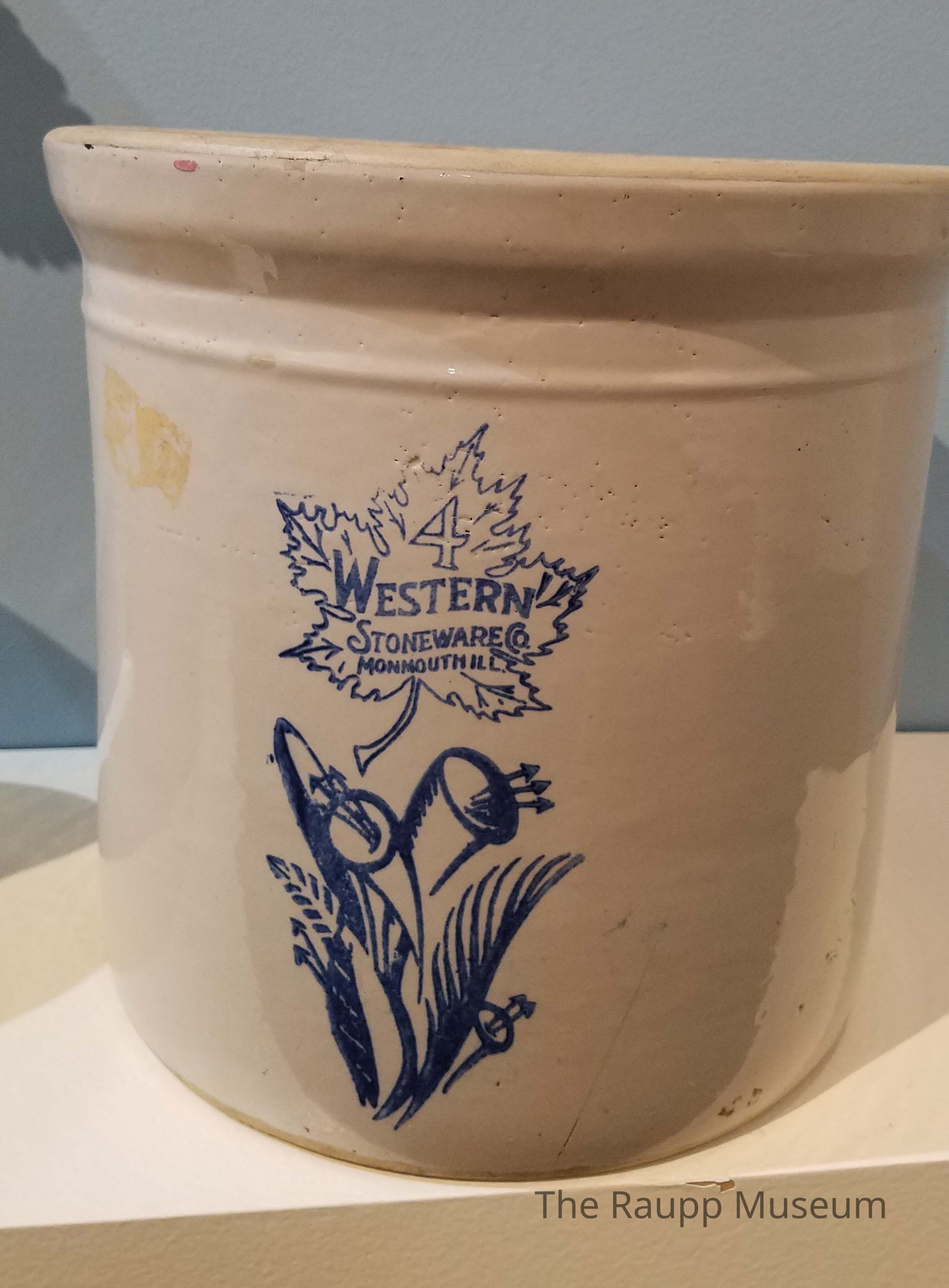 One (1) cream and blue stoneware crock, round, glazed along inside and out. "Western Stoneware Company" in blue glaze on surface with leaf design.Condition