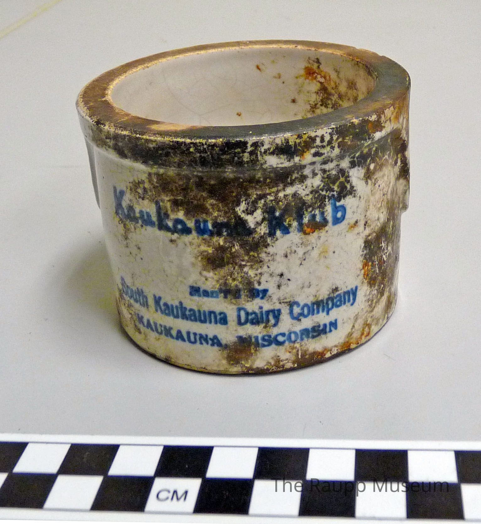 Small round crock with off-white finish and blue print. Text: "Kaukauna Klub man'rd by South Kaukauna Dairy Company, Kaukauna Wisconsin."