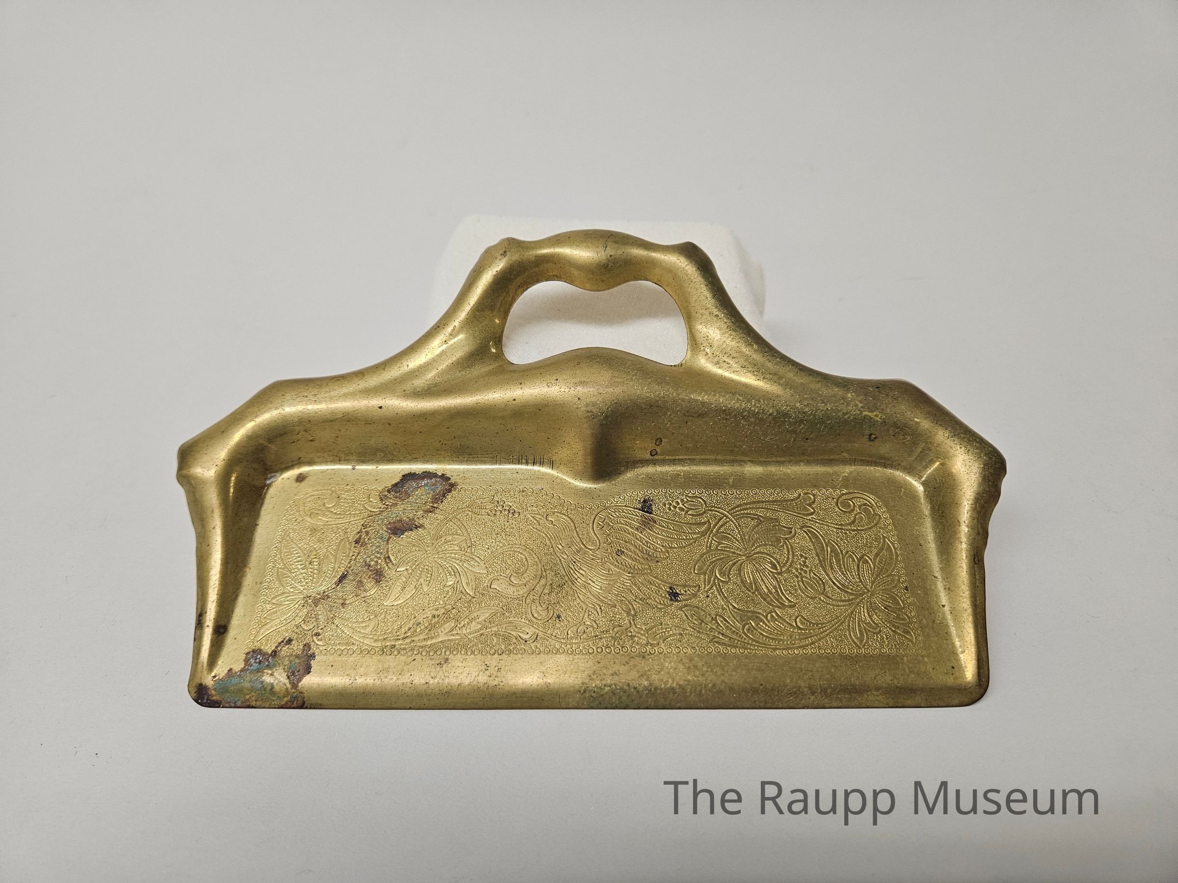 One (1) yellow metal crumber scraper. Crumber looks gold with an etched decorative design on the front of a bird surrounded by flowers. There is a handle on top that is slightly raised above the base of crumber scraper.Dimensions