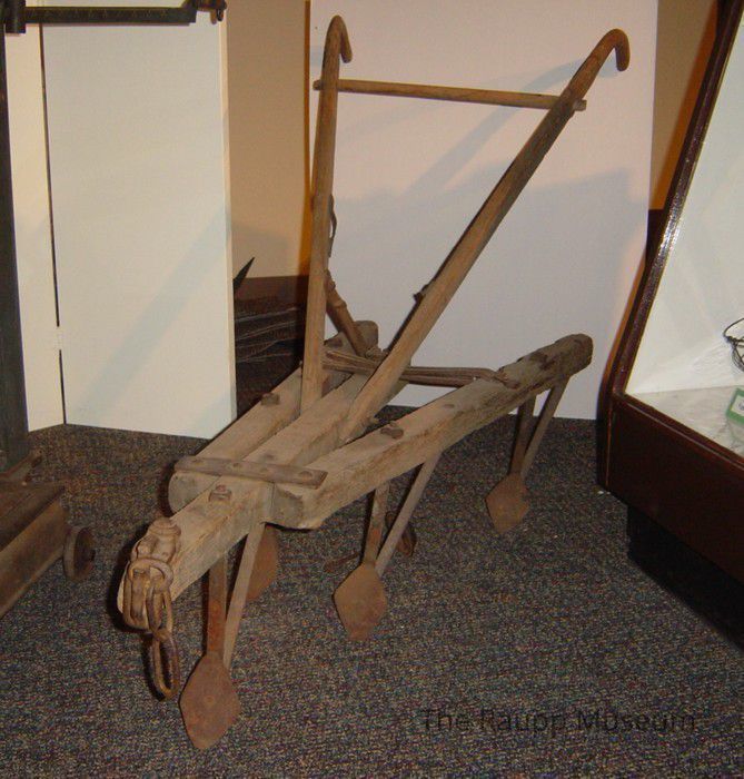 One (1) wooden cultivator hand plow. Has 5 tines for pushing soil.