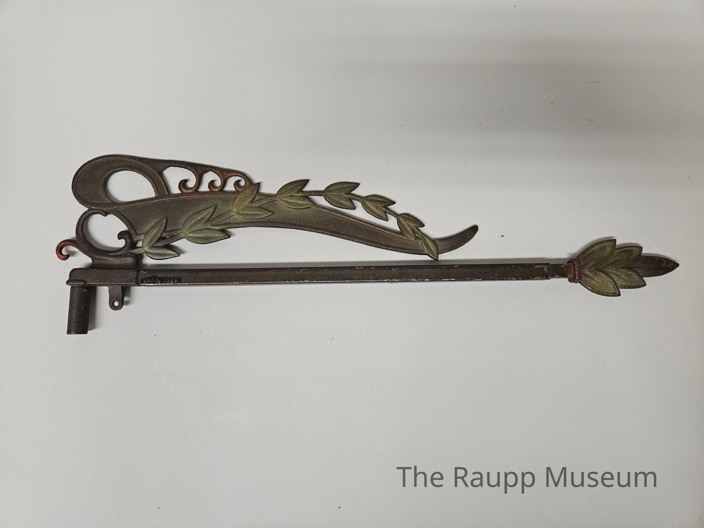 One (1) cast iron decorative curtain rod. Rod has a long square rod on bottom that ends in a leaf shaped that pulls in and out to extend the rod. Above is a thin decorative leaf and geometric design. The leaves have some green paint and there is red paint left on the top of the geometric patterns on top. There are four identical rods (2025.18.008A-2025.18.008D).Dimensions