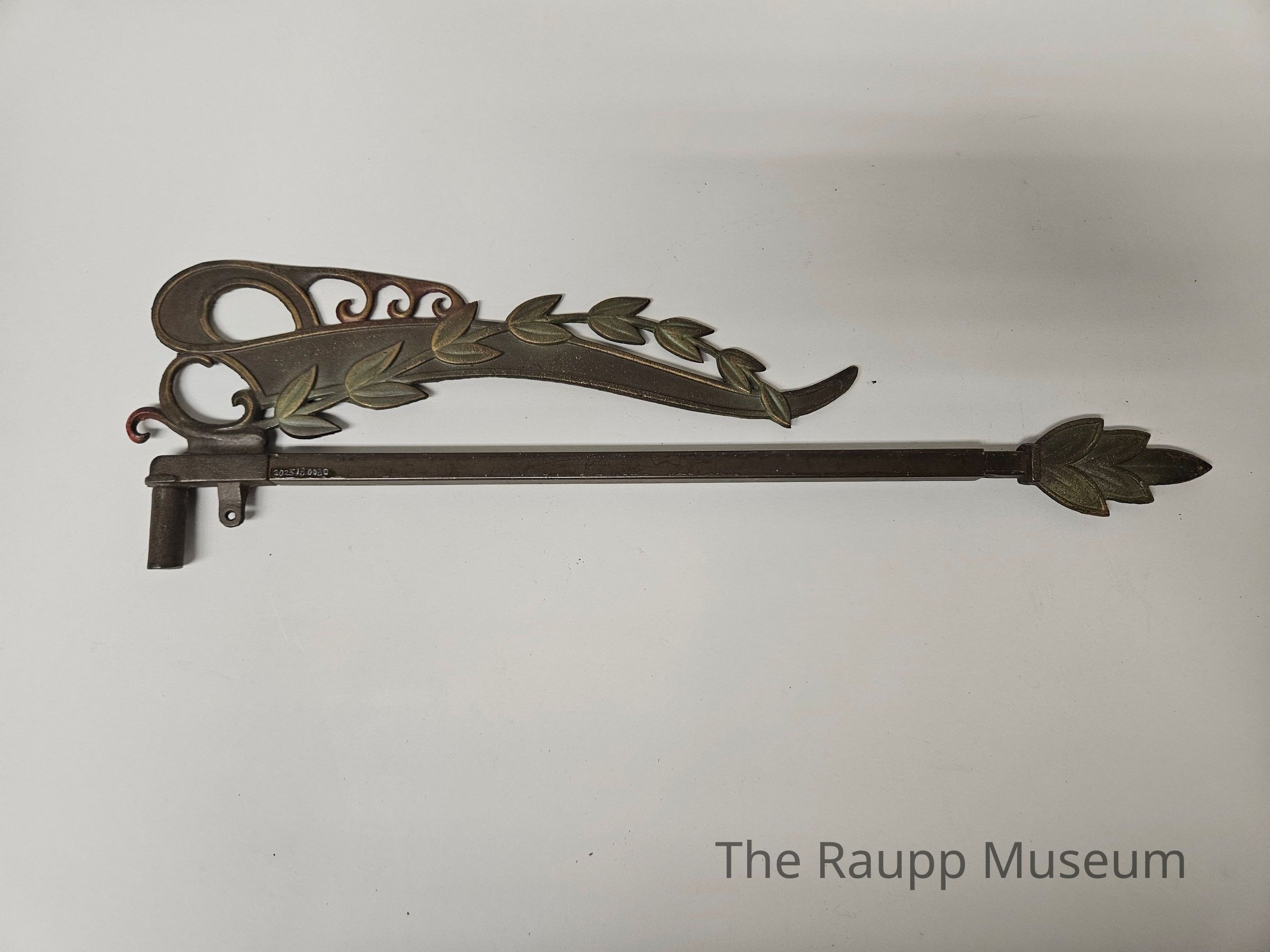 One (1) cast iron decorative curtain rod. Rod has a long square rod on bottom that ends in a leaf shaped that pulls in and out to extend the rod. Above is a thin decorative leaf and geometric design. The leaves have some green paint and there is red paint left on the top of the geometric patterns on top. There are four identical rods (2025.18.008A-2025.18.008D).Dimensions