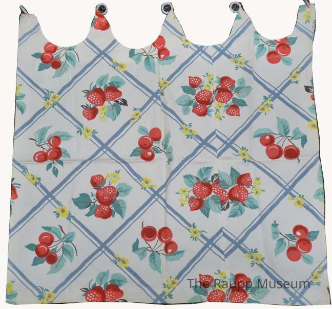 Group of two matching white curtains with blue lattice and strawberry print with plastic ring hardware. Café style length, looks homemade.