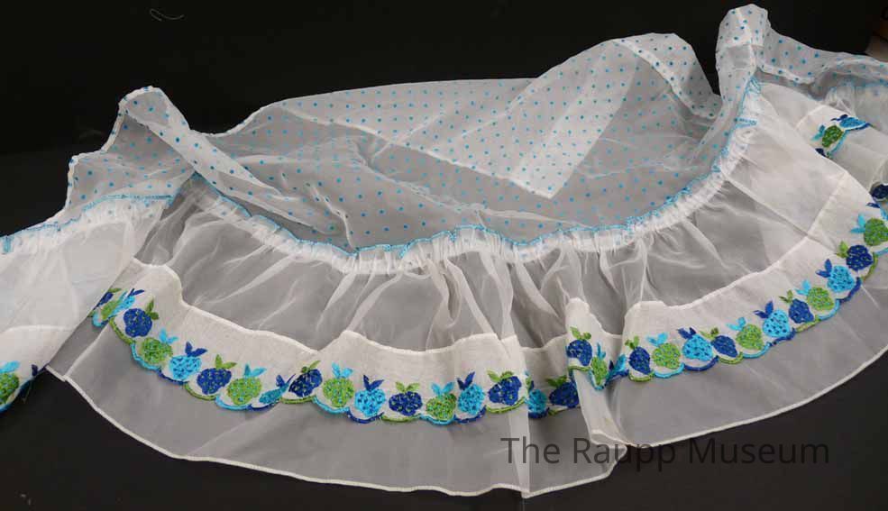 Group of two matching white transparent triangular-shaped nylon curtains with blue chenille polka dots and ruffle. Curtains have blue and green strawberry embroidery along a scalloped edge.