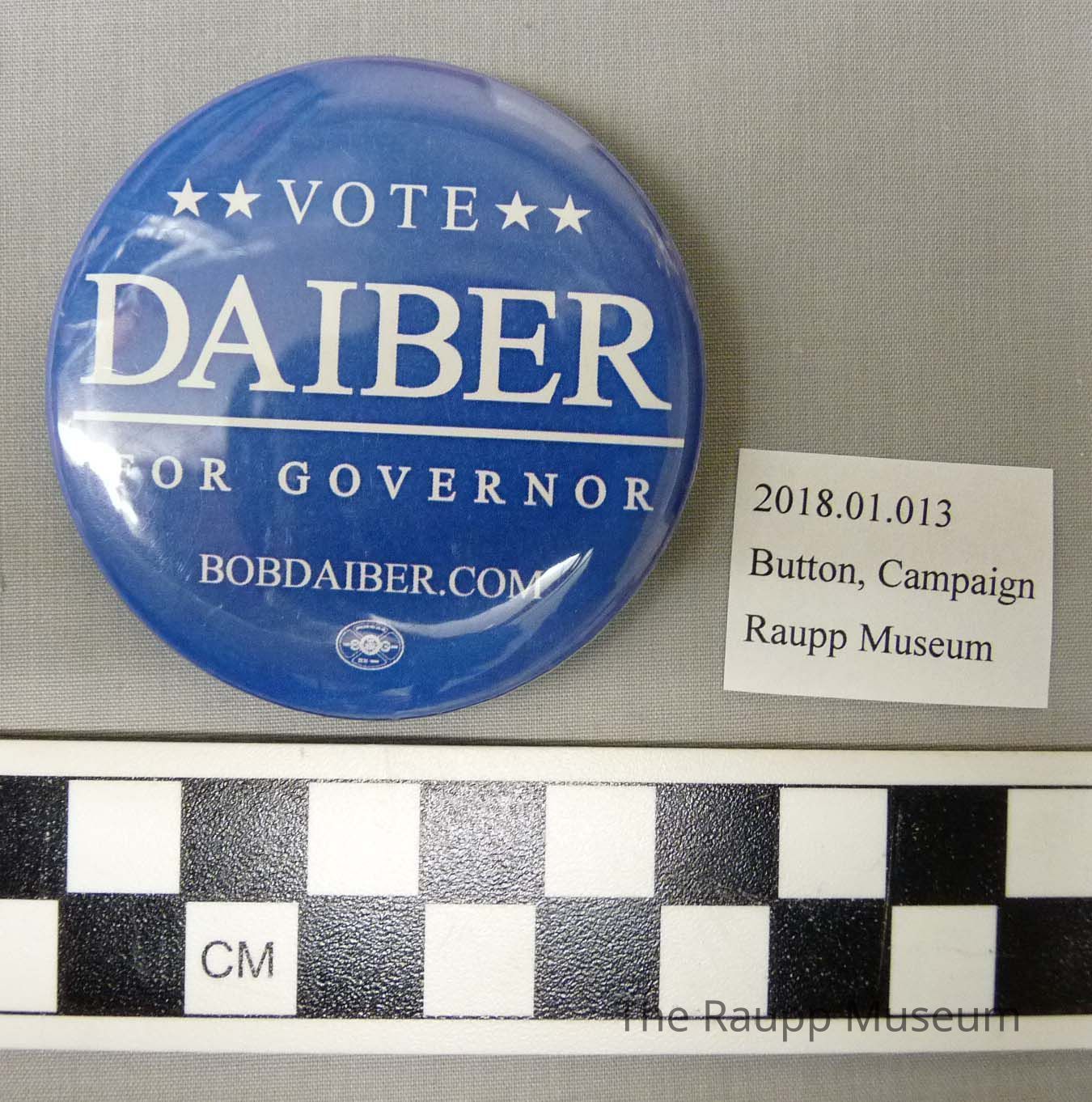 One (1) political button. The button has the text "Vote Daiber for Govenor bobdaiber.com" on one side, and silver on the back side. There are four stars next to "vote" on the front. The button is white and blue. There is a safety pin affixed to the back.Condition