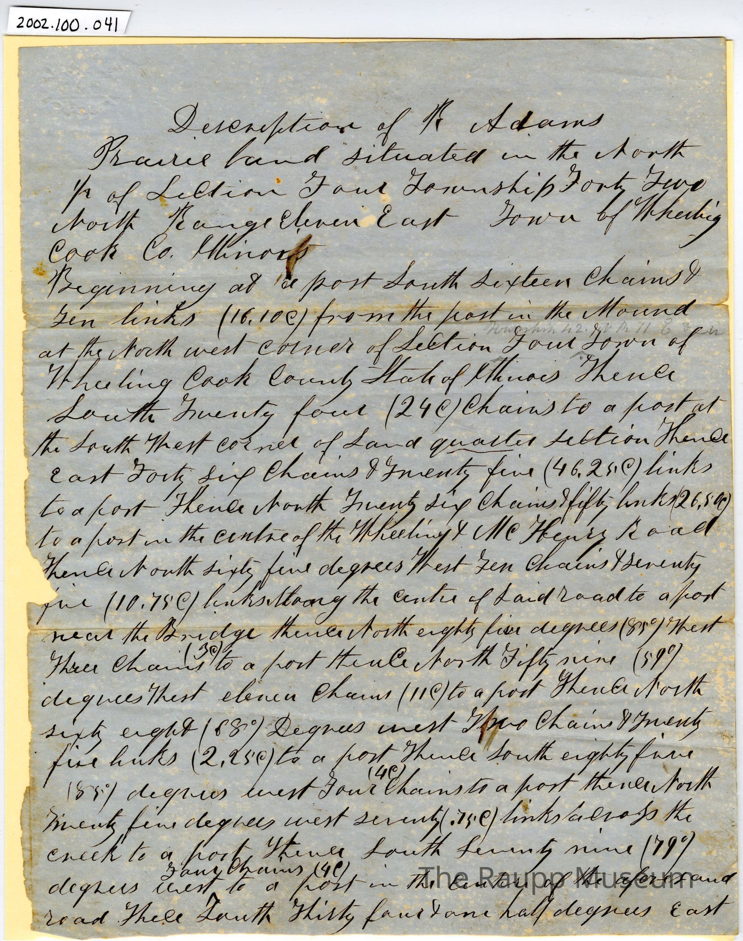 One (1) page log of a section of land in Wheeling Cook County. Log is a single blue page of text, handwritten in black ink. Unclear if a single page or part of a larger log of tracks of land (appears to be part of larger log, based on text.). The beginning begins: "Declaration of N. Adams Prairie Land situated in the north 1/2 of section..."