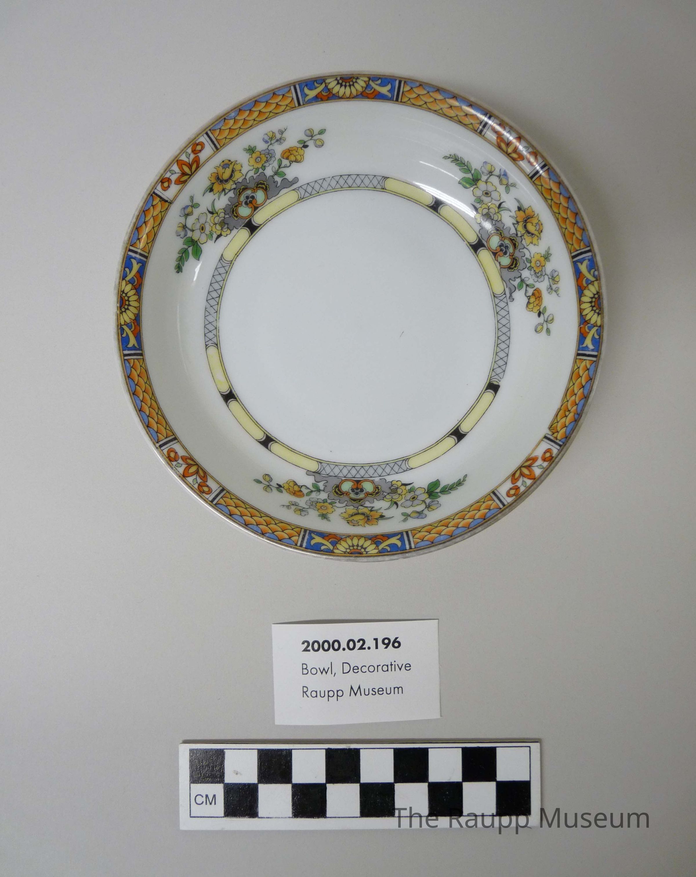 One (1) white, yellow, black, blue, orange, yellow, green china bowl. Small bowl with a decorative blue, organce and yellow rim. Flowers are painted in the bowl. On bottom: "Royal Bayreuth, Bavaria."Dimensions
