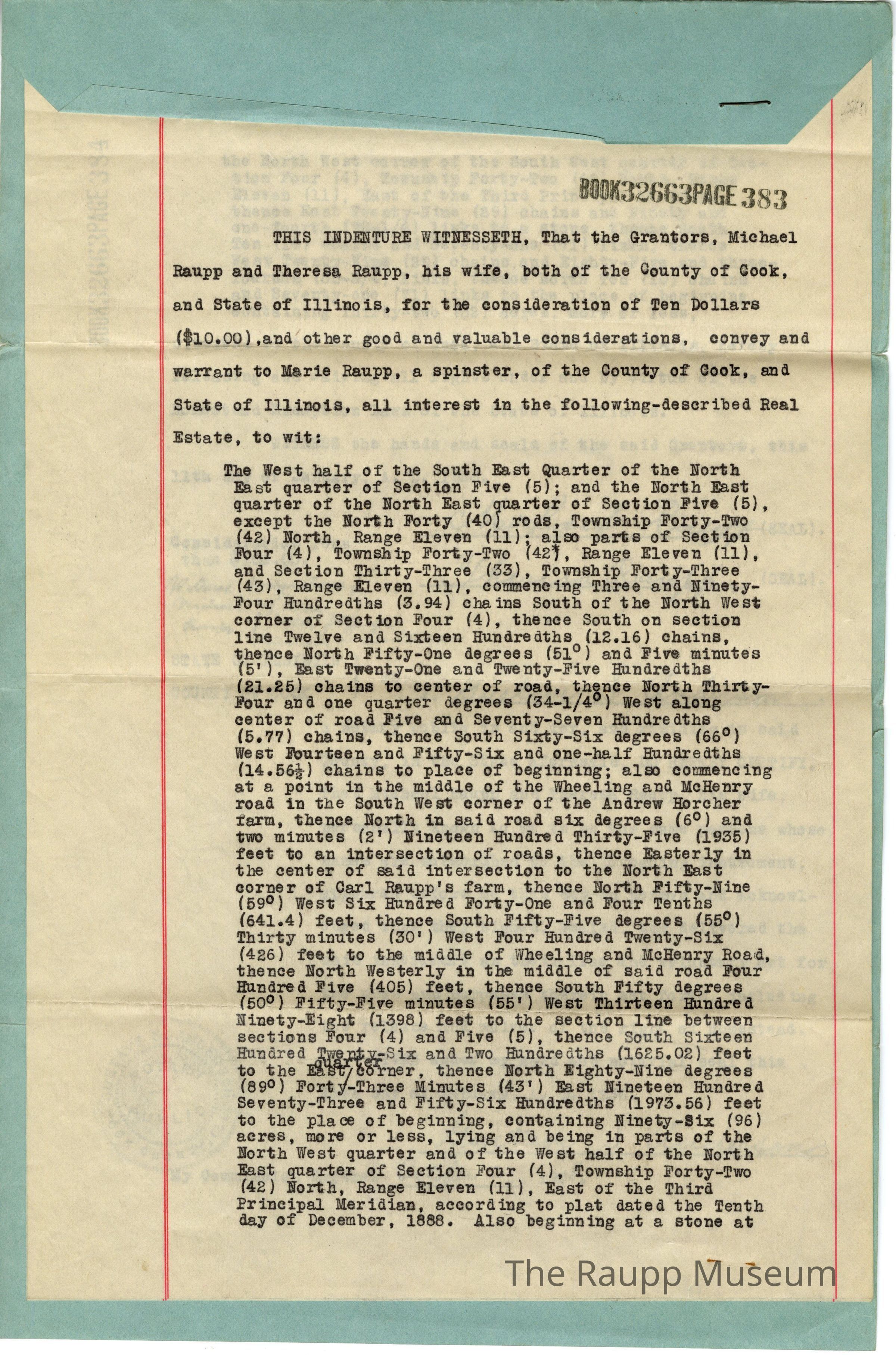 Two (2) page deed with an additional green page backing, land deed between Michael and Theresa Raupp and Marie Raupp in 1936. Pages are single sided, typed pages. The first page has "BOOK 32663PAGE383" at top. There are two red lines on both sides of page bordering. The Second page has "BOOK 32663PAGE384" on the left side. The second page continues the deed text, with signatures and notary statement at the bottom. The back of the second page has Cook County record stamp. The green page is a cover for the document on back and folds together to house document. On one side is typed "mail to Michael Raupp R.F.D. #1, Prairie View, ILL." and a Walter J. Spengler sticker. There is a staple on the top right corner.Archive Details