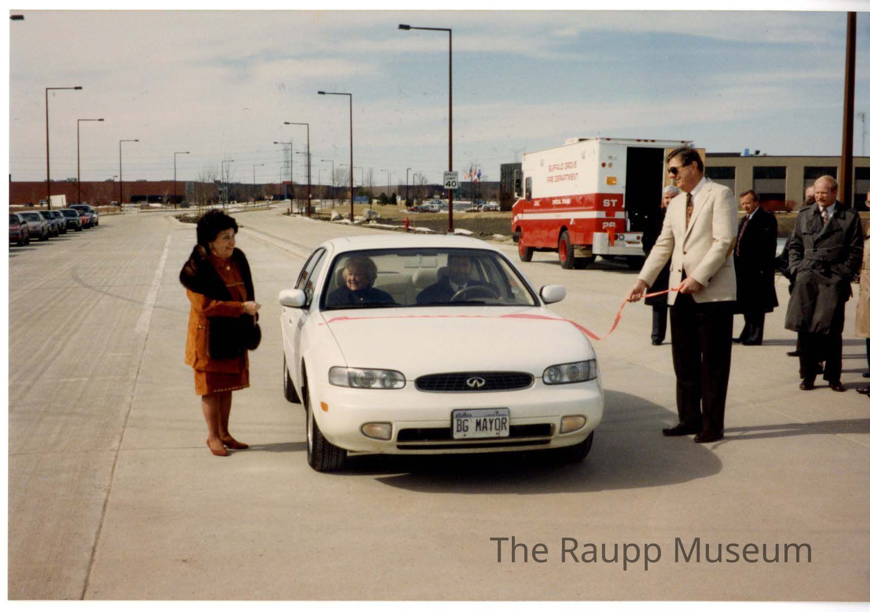 One (1) color photo of a women on left in orange and brown and a man on right of a white sedan with two people in it, hold a red ribbon over the car. Men on right watch. Celebrating the opening of Deerfield Parkway.Made/Created