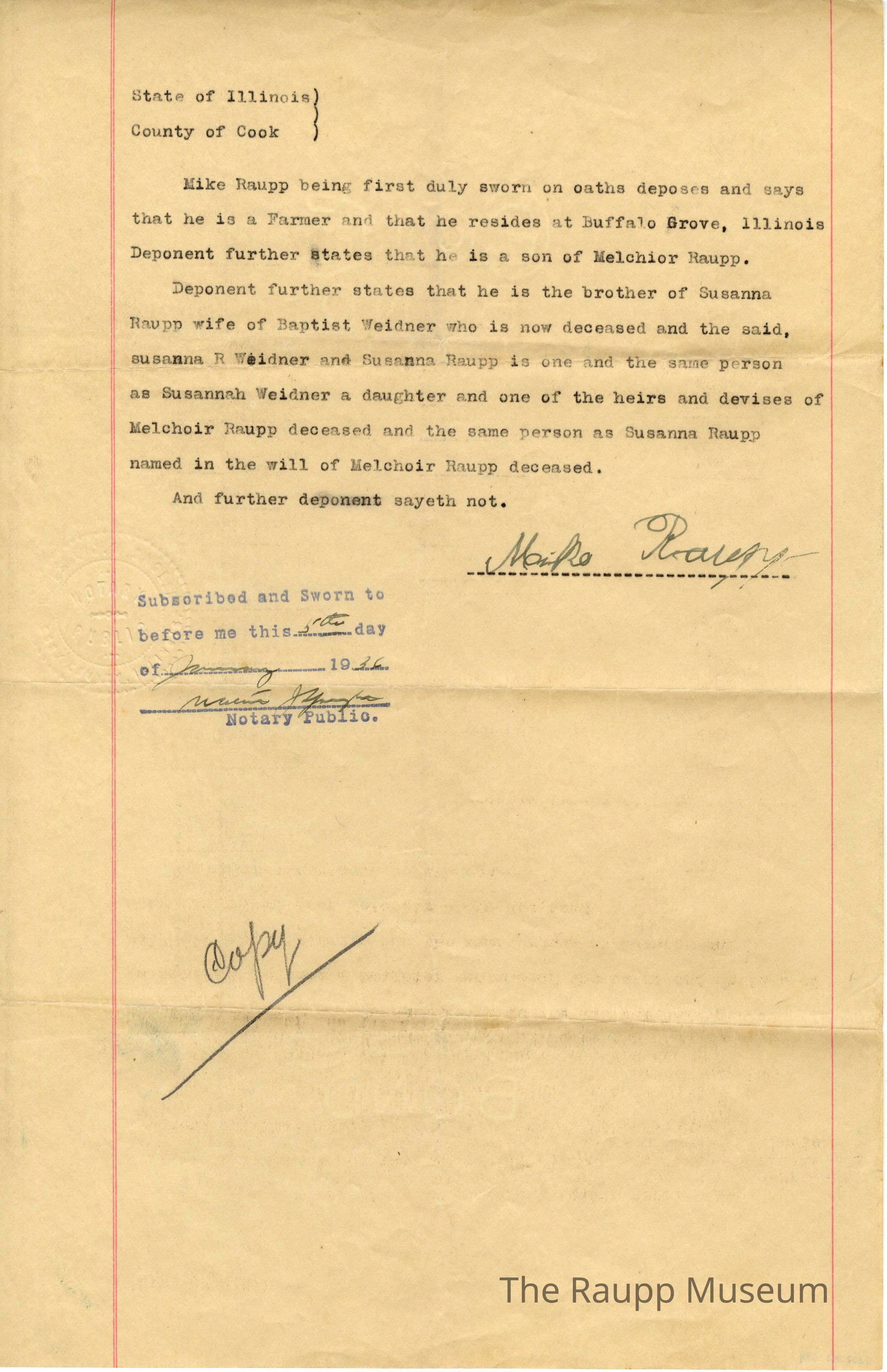 Deposition of Mike Raupp re. Susanna Raupp 01/05/1936Entry/Object ID