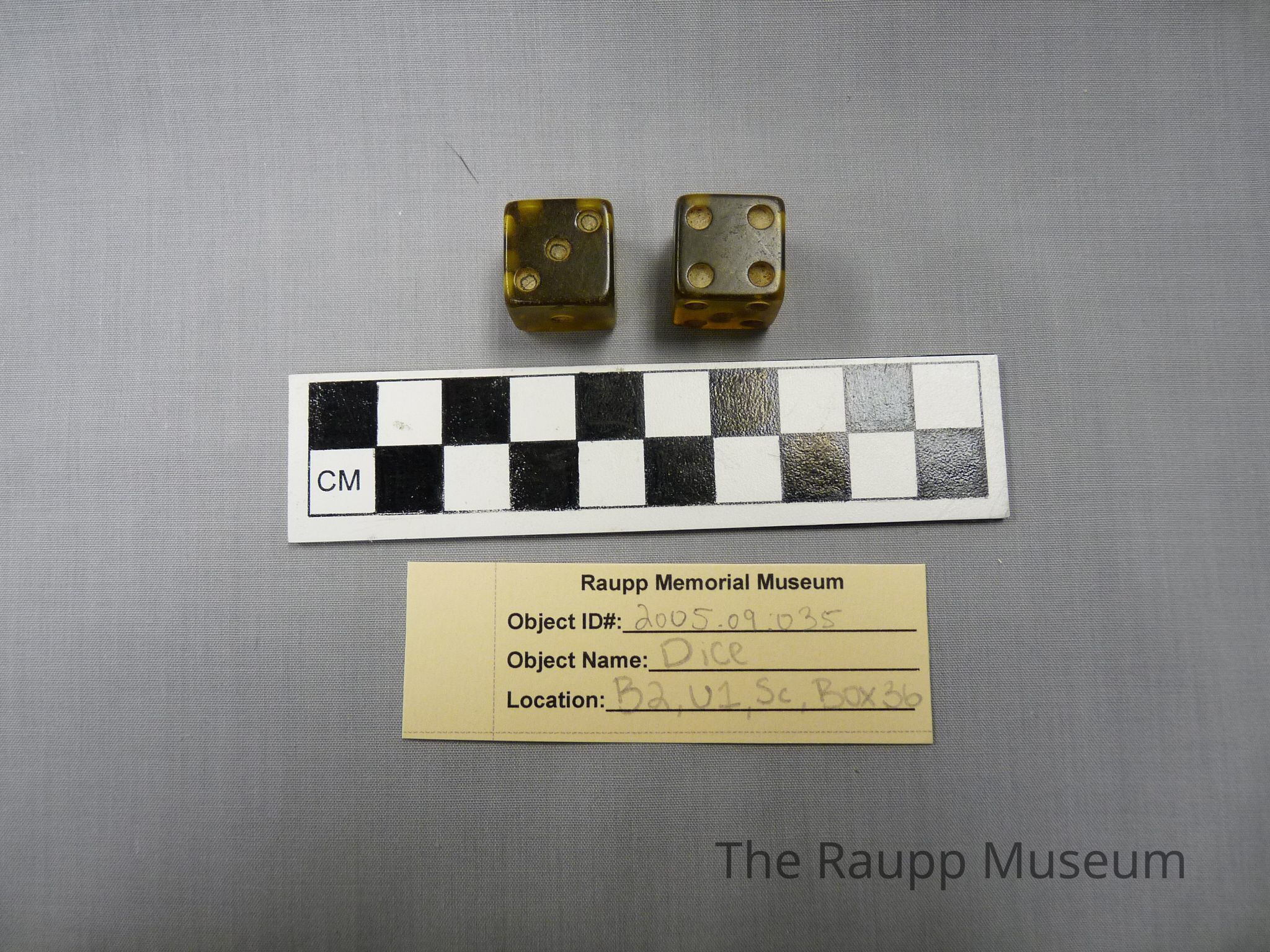 One (1) set of translucent green and white dice. Each die is a standard six sided dice with white dots.Dimensions