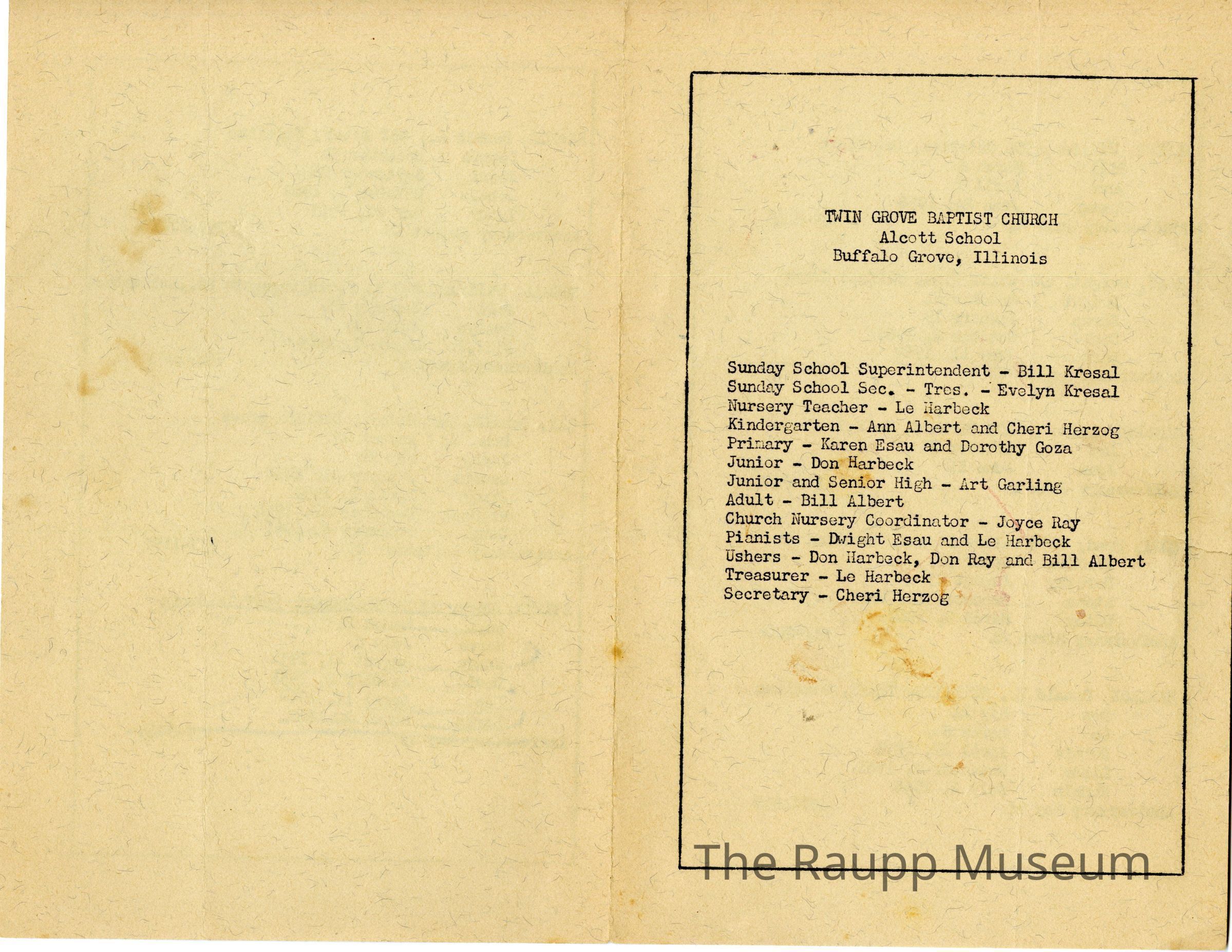 One (1) double-sided typed directory/program for Twin Grove Baptist Church at Alcott School (date unknown). Paper is brown with black typed information. The paper is folded in the center, to be a four page program. The cover has "Twin Grove Baptist Church, Alcott School, Buffalo Grove, Illinois" along with all the church staff listed. The inside has 2 pages of members of the church, with address, their children (and birthdays), and Anniversary dates. Fred Goza's phone number is crossed out and a new one handwritten in blue ink. The entry for Hugh Steven family is crossed out.Archive Details