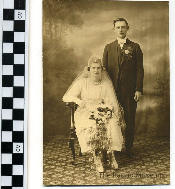Sepia colored image without border. Professional wedding portrait. Image of a man standing on the right and wearing a dark suit with a white bow tie. He has a boutonniere with a lot of greens around it. A woman is seated in the chair on the left wearing an ankle length wedding dress square neckline and tulle veil. She has a bouquet of white flowers with long ribbons and greenery on her lap. Studio backdrop of blurry trees behind them and a geometric carpet pattern. reverse side ink inscription: "Jone Dohmen Grandma Raupp's cousin."Dimensions