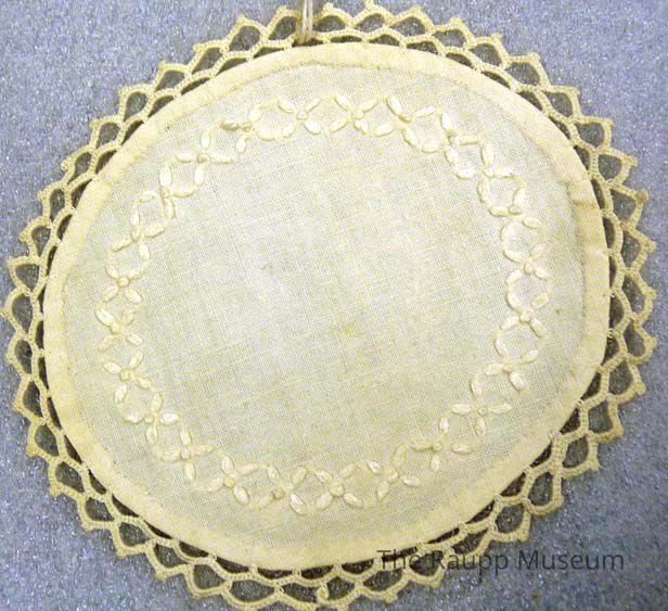 Circular, slightly oval off-white doily with linen center and 0.5 inch pointed crochet lace trim. With white cross stitch embroidery circle on the linen.