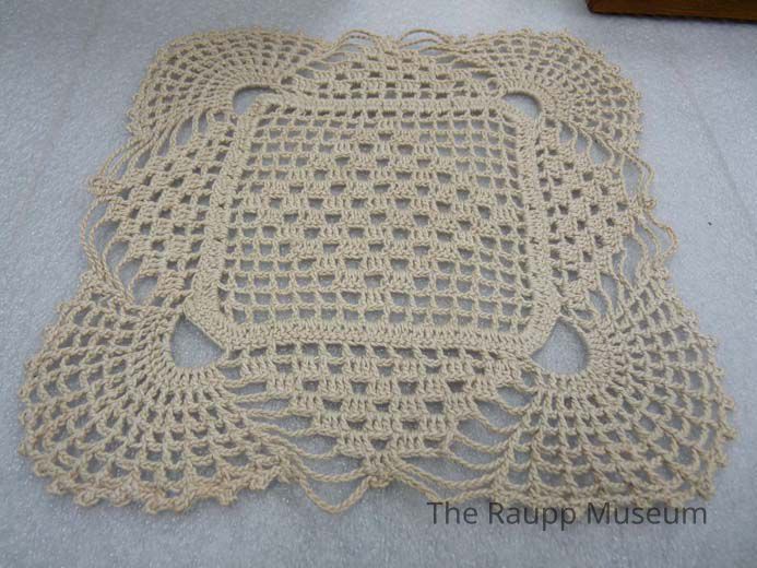 Group of two identical square beige doilies with scalloped edges and square inlay with centered diamond pattern.