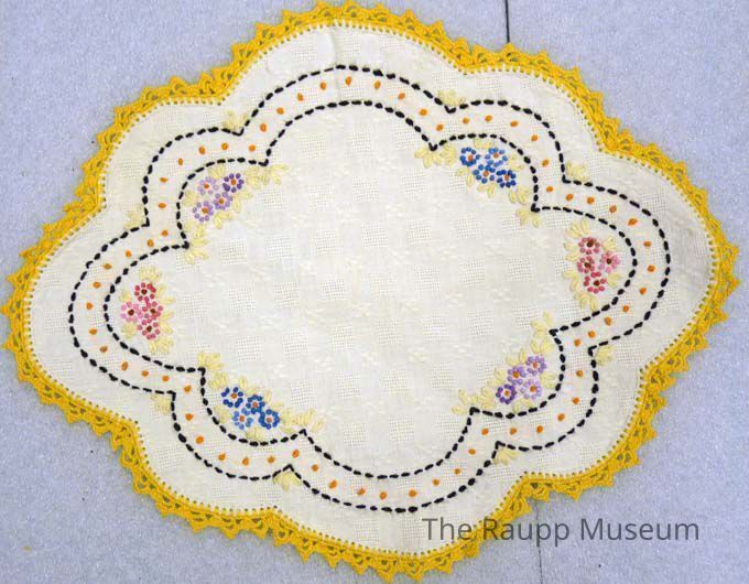 Oval off-white linen doily with white scalloped edges and 0.25 inch yellow crochet lace. With square patterns on the linen and embroidered black border and beige, pink, purple, and blue floral embroidery on the linen.