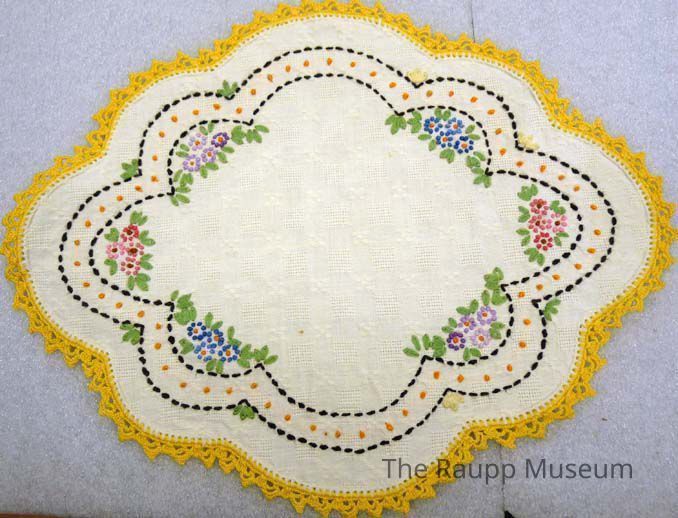 Oval off-white linen doily with wide scalloped edges and 0.25 inch yellow crochet lace. With square patterns on the linen and embroidered black border and green, pink, purple, and blue floral embroidery on the linen.