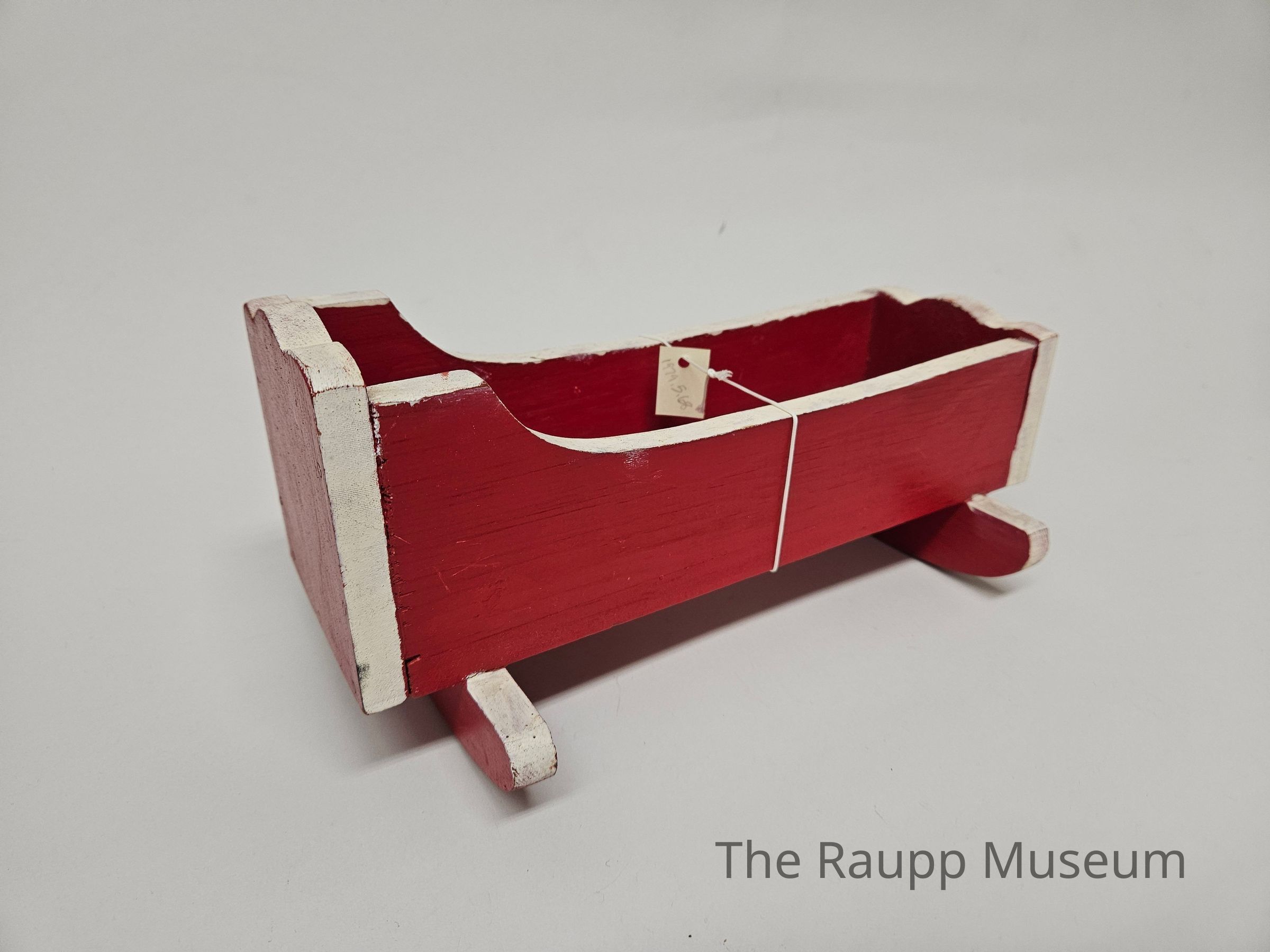 One (1) doll cradle. Made of wood with wooden rockers at the head and foot. Head and footboards are scalloped with the headboard higher up than the footboard. Sideboards are straight until three (3) inches before the head board when they slope up one (1) inch to the head board. The sides and interior of the cradle are painted red; the edges are painted white. The white paint is not thick and the red paint underneath shows through in spots. The cradle rocks side-to-side. Pieces are nailed together. Uneven painting.Dimensions