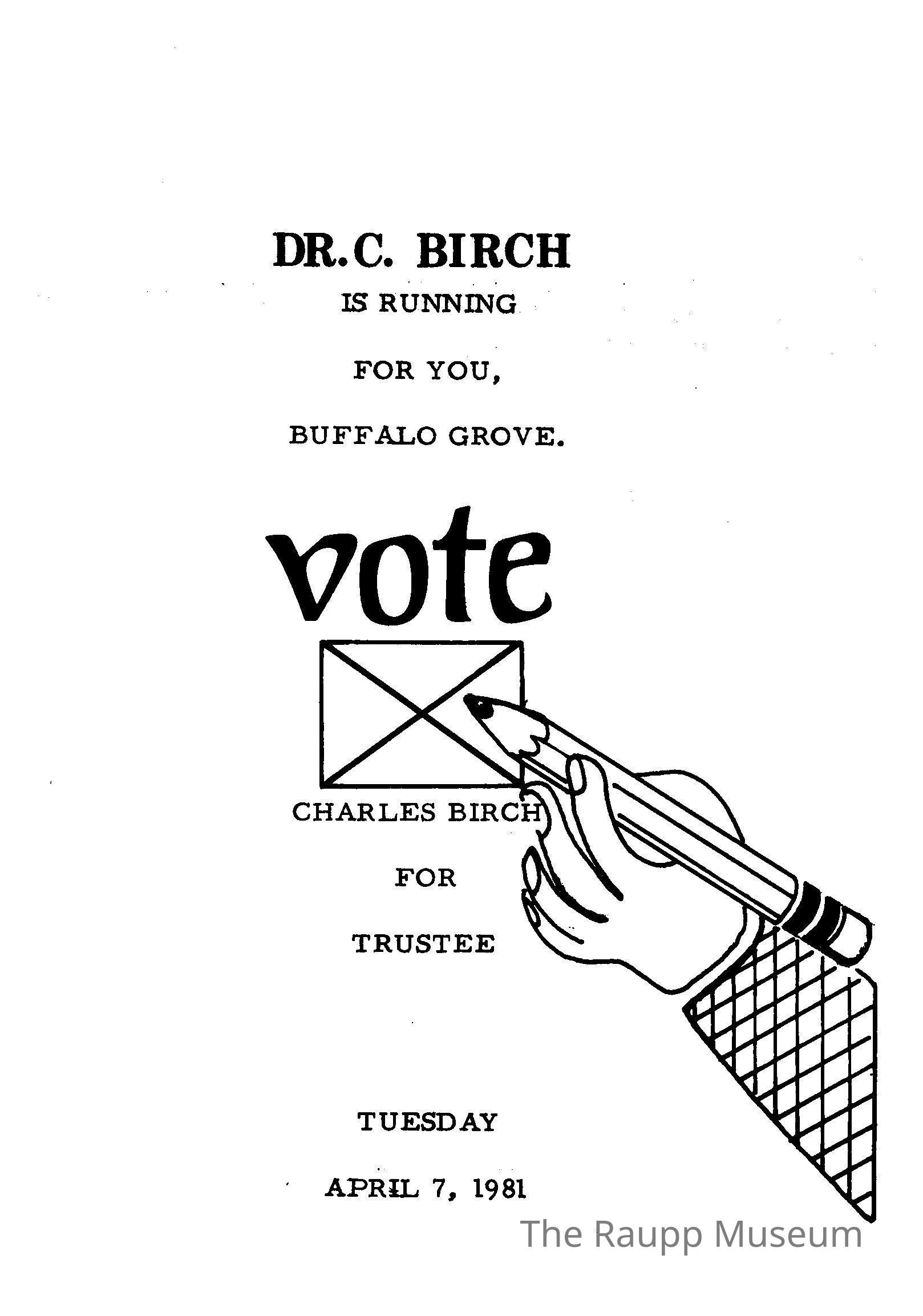 One (1) white election pamphlet for Dr. C. Birch for Trustee. Contains four pages with qualifications inside and a drawing of his face on the back side.