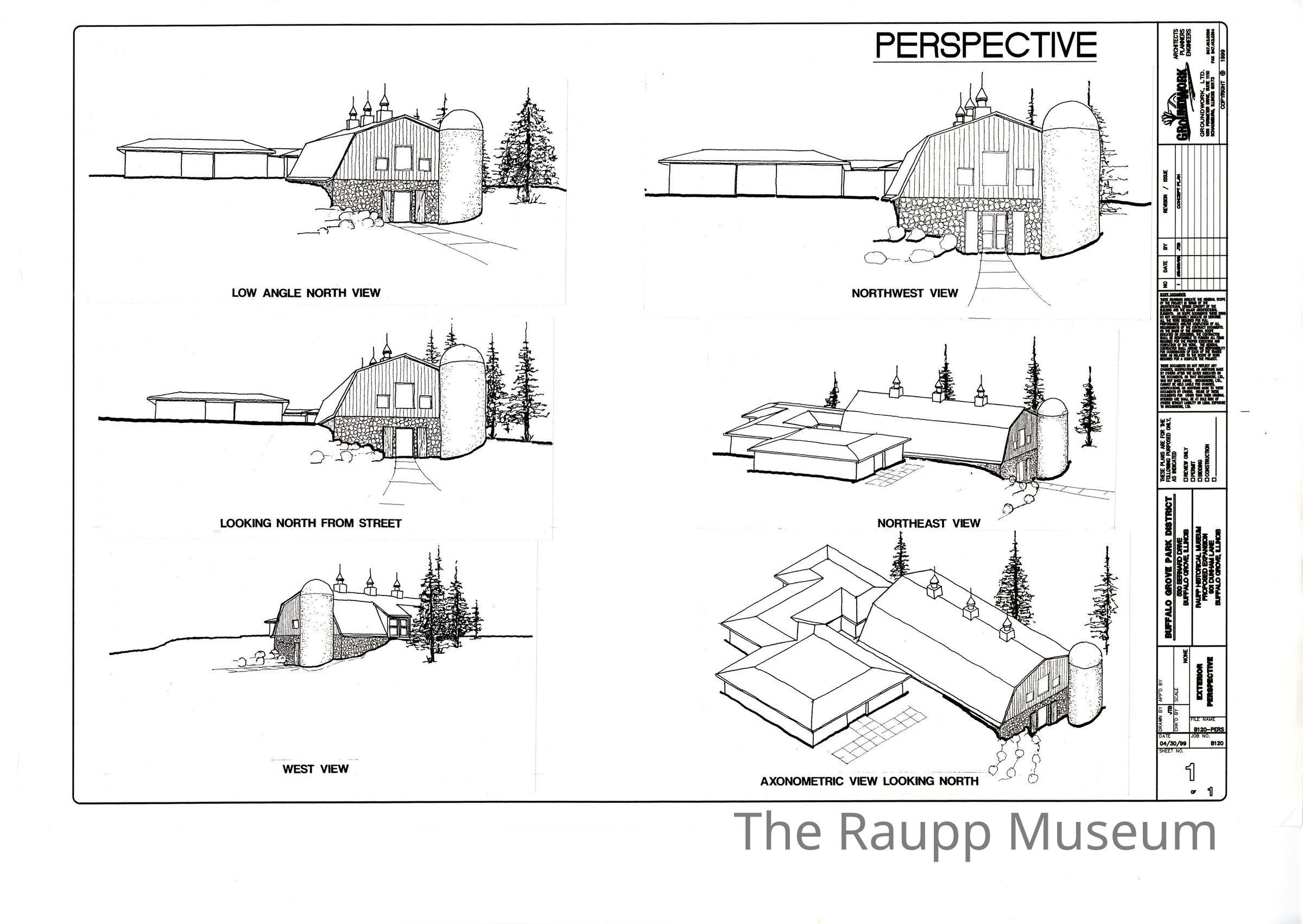 One (1) page of six concept drawing perspective views of original barn concept for Raupp Museum.