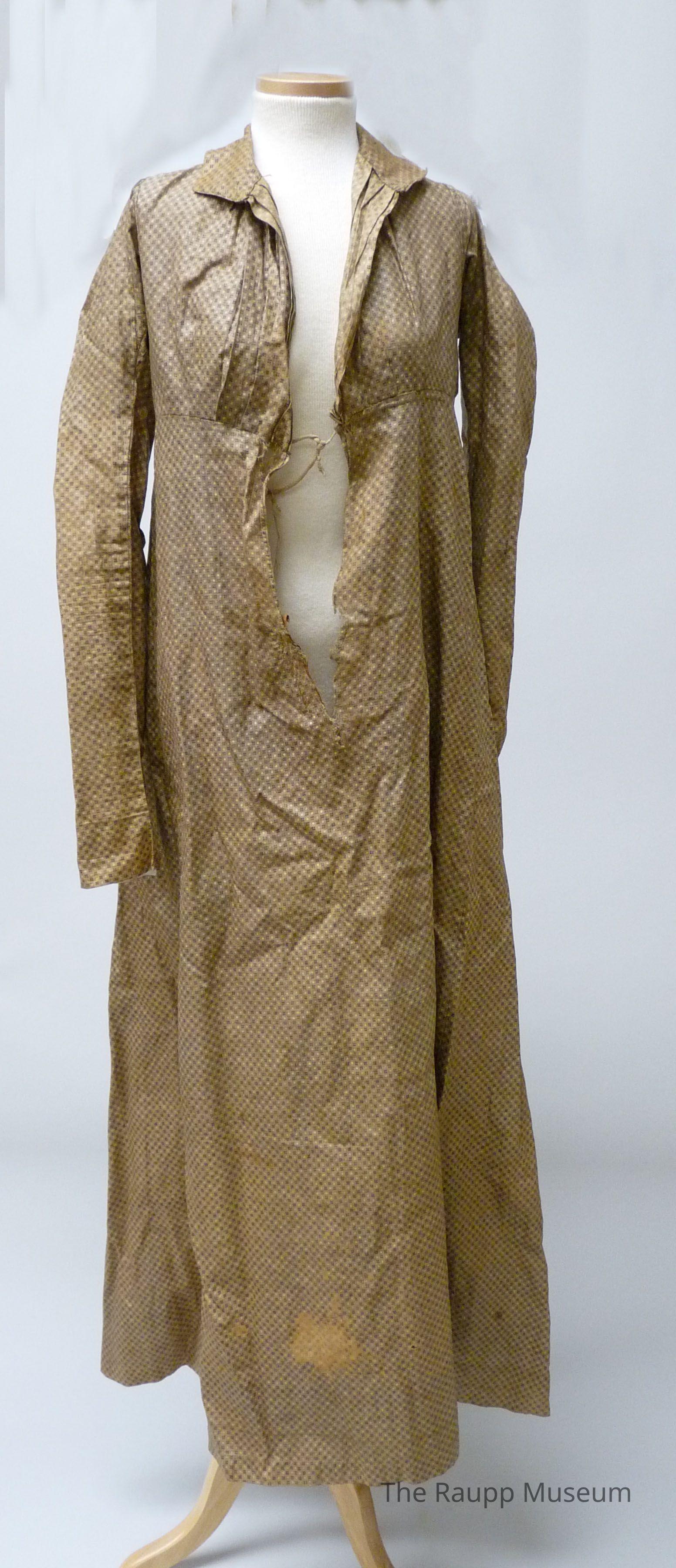 One (1) brown linen dress. Homemade woman's full length dress with deeply inset long sleeves, gathered in back; tucked bodice; box pleated rear skirt; tie closure; fabric brown with cream and dark brown spots; bodice lined in cream linen.