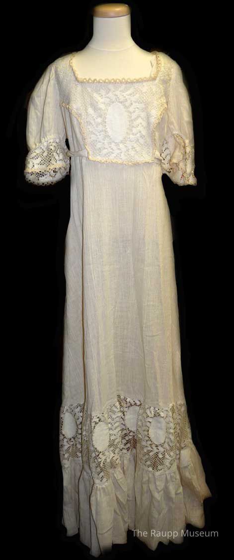 Off-white, unbleached, heavy gauzy fabric dress. With short puff sleeves and long skirt. Lace trim around yolk, sleeves, and between the skirt and skirt ruffle. Zipper closure down back with ties around the waist made of the same gauzy material. Discolored label tag has maker's information and washing information embroidered on it.