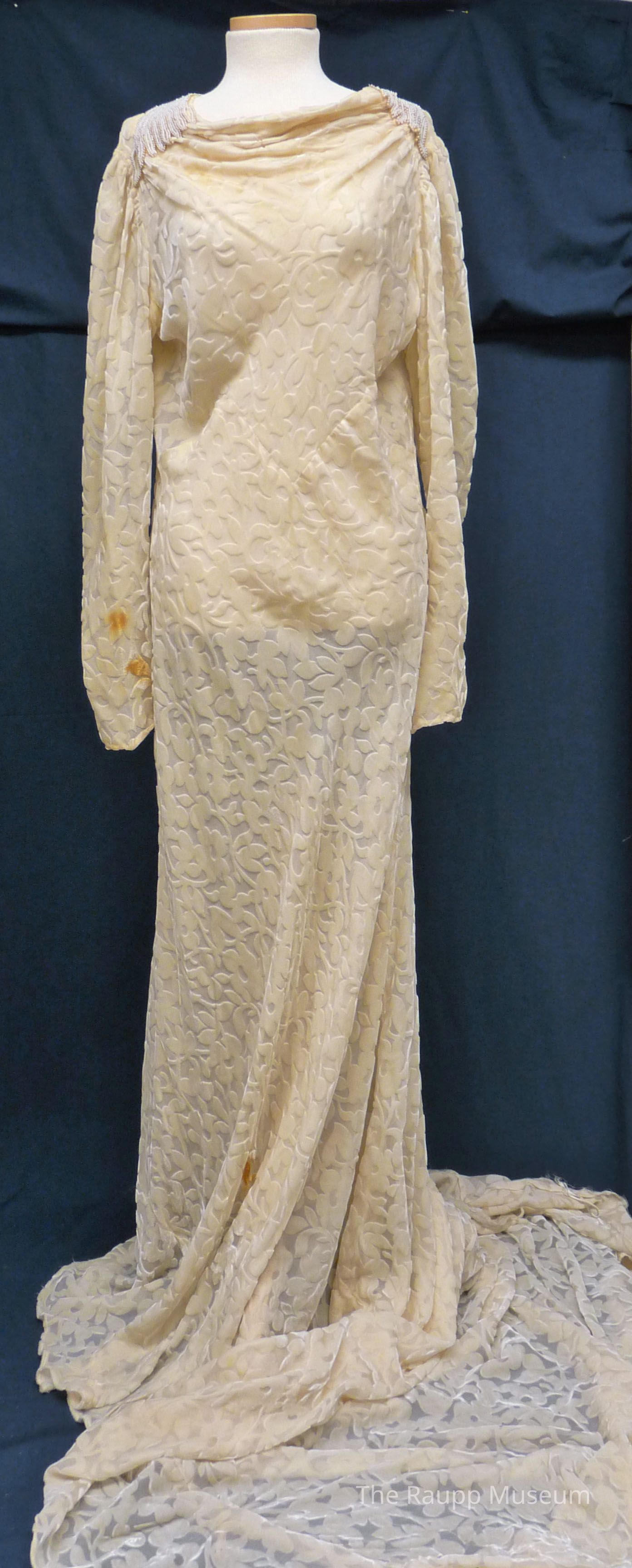 Long off-white wedding gown with cowl neck, long sleeves with beading appliques on shoulders and back of neck. Fabric is sheer with velvet brocade, train made of same fabric. With velvet-covered button closures down the back of the dress.Relationships