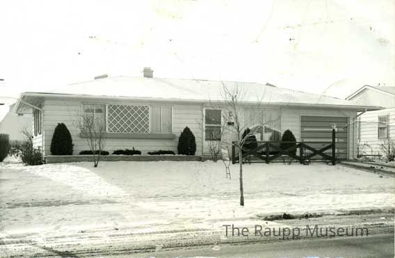 Black and white print. Image of the exterior of a ranch house. Back of the photo has pencil handwritten text in lower area: “423 Bernard, Buffalo Grove- AH/ 1-5-68."  reverse also has ink number in lower right corner “26563.”