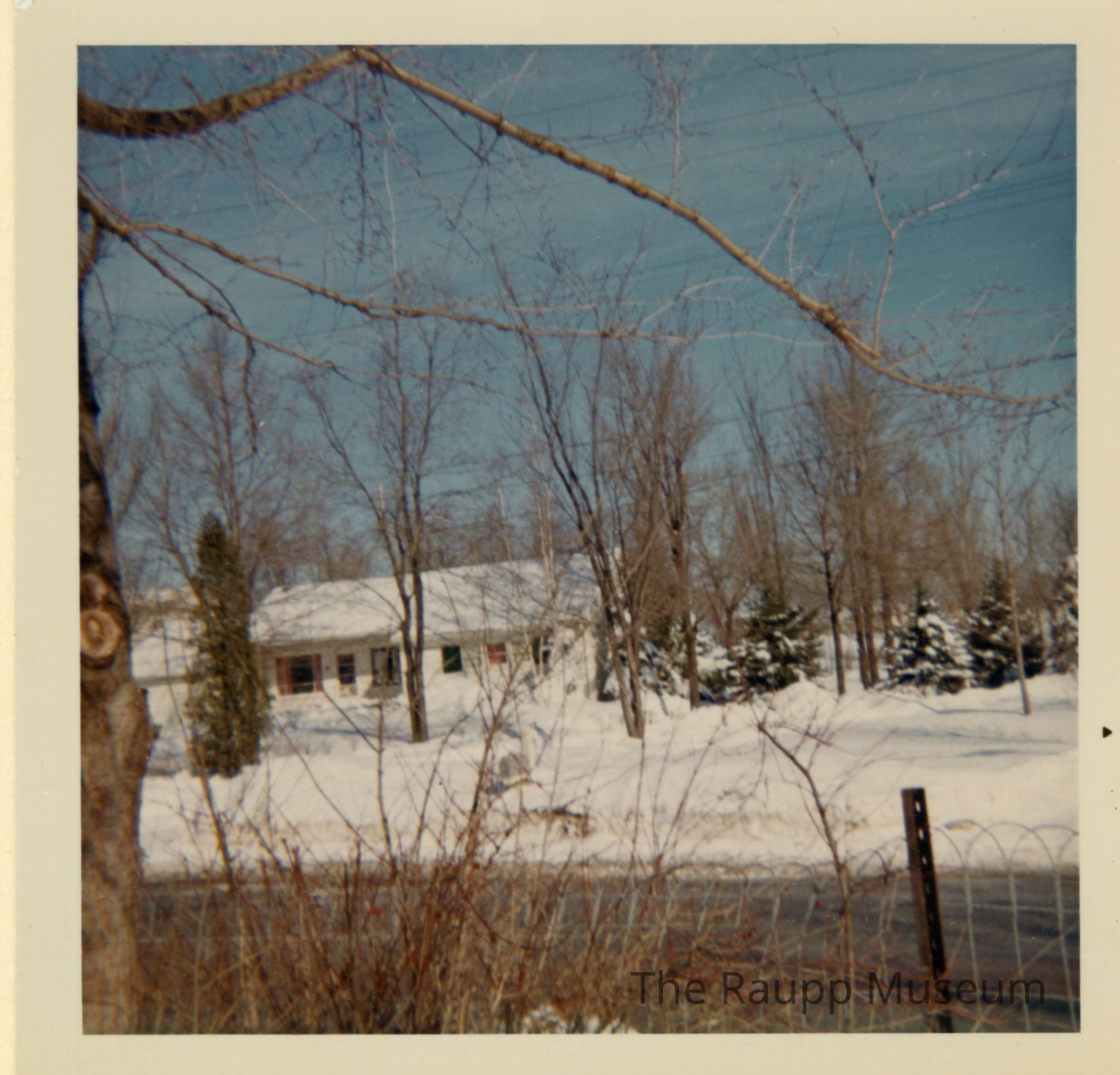 One (1) color photograph looking across the street of Buffalo Grove Road, looking East. There is a tree and wire fence in foreground, with a single story white house across the street, with trees on the right.