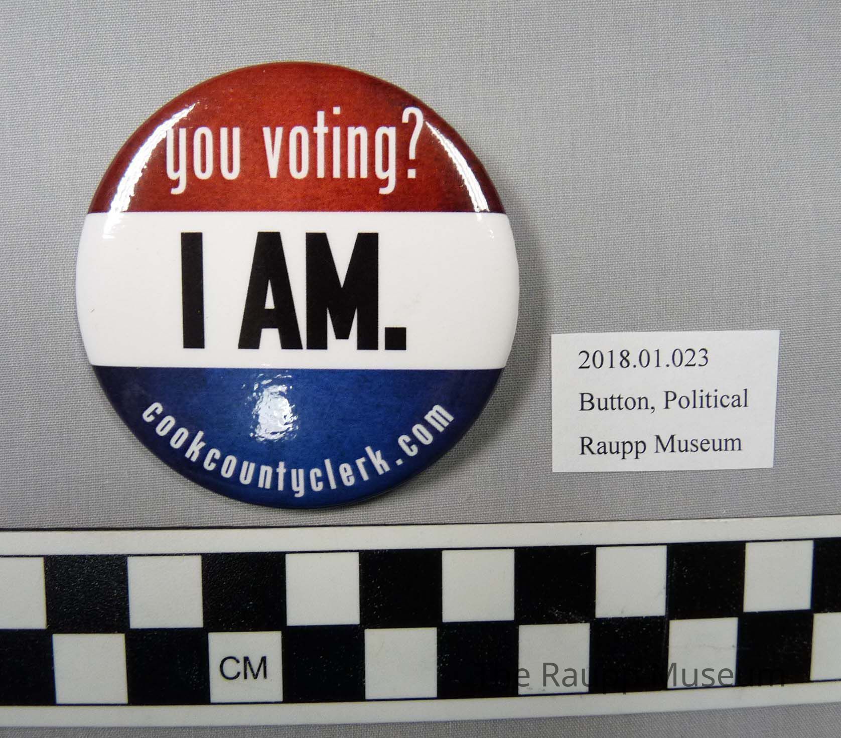 One (1) political button. The button has the text "you voting? I am. cookcountycleark.com" on one side, and silver metal on the back side. The button is white, red, blue, and black. There is a safety pin affixed to the back.Condition