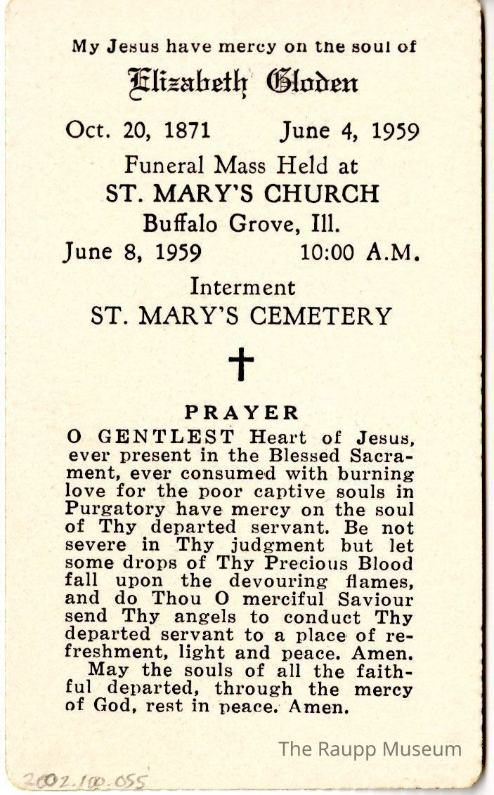 Elizabeth Gloden Funerary Card 1959Entry/Object ID